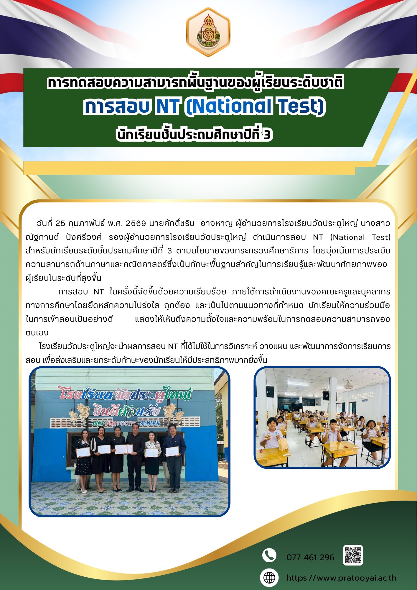 วันที่ 25 กุมภาพันธ์ พ.ศ. 2569 นายศักดิ์ชริน อาจหาญ ผู้อำนวยการโรงเรียนวัดประตูใหญ่ นางสาวณัฐิกานต์ ปังศรีวงศ์ รองผู้อำนวยการโรงเรียนวัดประตูใหญ่ ดำเนินการสอบ NT (National Test) สำหรับนักเรียนระดับชั้นประถมศึกษาปีที่ 3 ตามนโยบายของกระทรวงศึกษาธิการ โดยมุ่งเน้นการประเมินความสามารถด้านภาษาและคณิตศาสตร์ซึ่งเป็นทักษะพื้นฐานสำคัญในการเรียนรู้และพัฒนาศักยภาพของผู้เรียนในระดับที่สูงขึ้น การสอบ NT ในครั้งนี้จัดขึ้นด้วยความเรียบร้อย ภายใต้การดำเนินงานของคณะครูและบุคลากรทางการศึกษาโดยยึดหลักความโปร่งใส ถูกต้อง และเป็นไปตามแนวทางที่กำหนด นักเรียนให้ความร่วมมือในการเข้าสอบเป็นอย่างดี แสดงให้เห็นถึงความตั้งใจและความพร้อมในการทดสอบความสามารถของตนเอง โรงเรียนวัดประตูใหญ่จะนำผลการสอบ NT ที่ได้ไปใช้ในการวิเคราะห์ วางแผน และพัฒนาการจัดการเรียนการสอน เพื่อส่งเสริมและยกระดับทักษะของนักเรียนให้มีประสิทธิภาพมากยิ่งขึ้น
