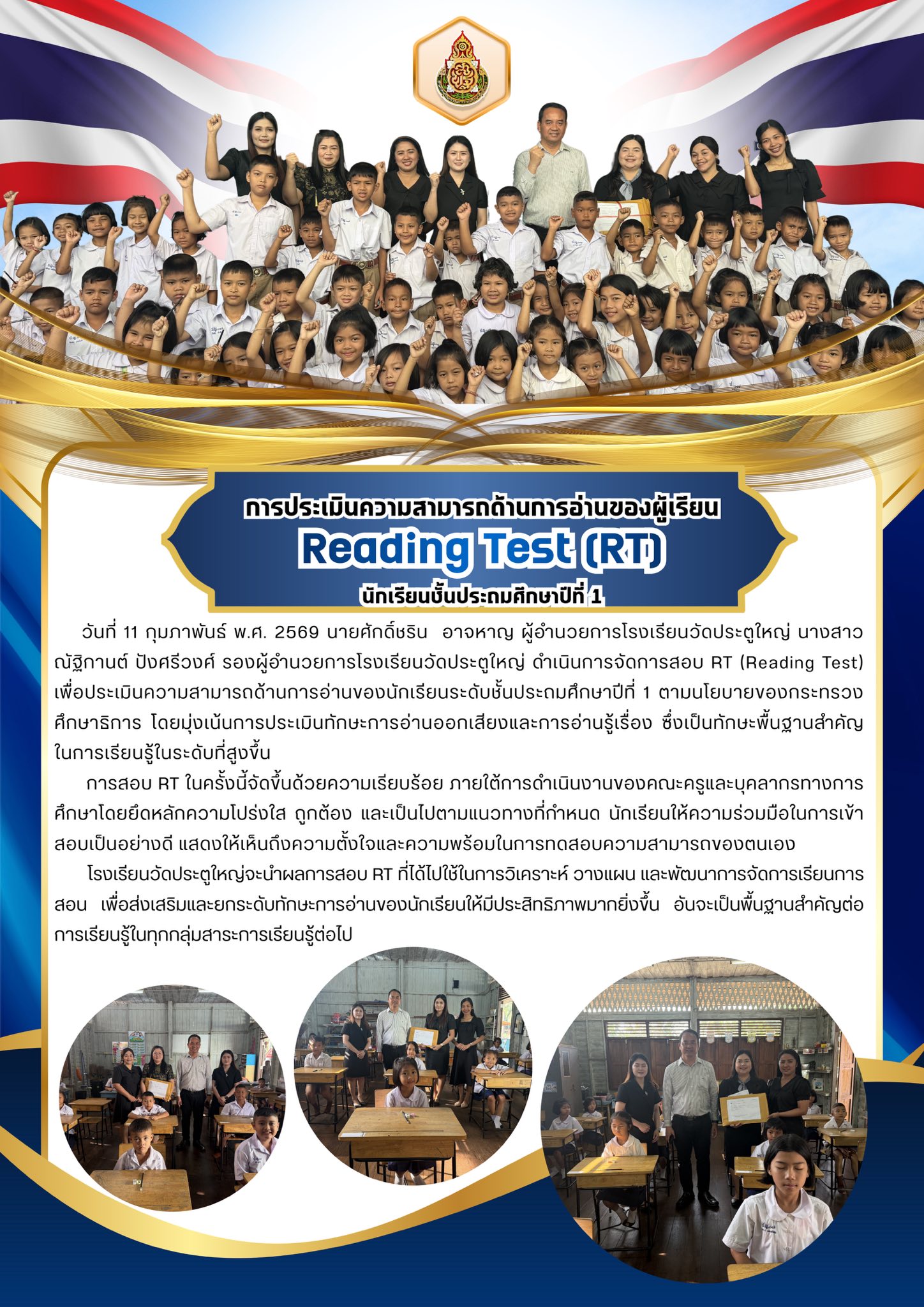 วันที่ 11 กุมภาพันธ์ พ.ศ. 2569 นายศักดิ์ชริน อาจหาญ ผู้อำนวยการโรงเรียนวัดประตูใหญ่ นางสาวณัฐิกานต์ ปังศรีวงศ์ รองผู้อำนวยการโรงเรียนวัดประตูใหญ่ ดำเนินการจัดการสอบ RT (Reading Test) เพื่อประเมินความสามารถด้านการอ่านของนักเรียนระดับชั้นประถมศึกษาปีที่ 1 ตามนโยบายของกระทรวงศึกษาธิการ โดยมุ่งเน้นการประเมินทักษะการอ่านออกเสียงและการอ่านรู้เรื่อง ซึ่งเป็นทักษะพื้นฐานสำคัญในการเรียนรู้ในระดับที่สูงขึ้น