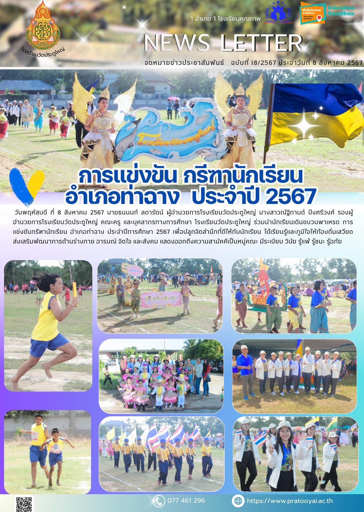 วันพฤหัสบดี ที่ 8 สิงหาคม 2567 นายธนนนท์ ลดารัตน์ ผู้อำนวยการโรงเรียนวัดประตูใหญ่ นางสาวณัฐิกานต์ ปังศรีวงศ์ รองผู้อำนวยการโรงเรียนวัดประตูใหญ่ คณะครู และบุคลากรทางการศึกษา โรงเรียนวัดประตูใหญ่ ร่วมนำนักเรียนเดินขบวนพาเหรด การแข่งขันกรีฑานักเรียน อำเภอท่าฉาง ประจำปีการศึกษา 2567 เพื่อปลูกจิตสำนึกที่ดีให้กับนักเรียน ได้เรียนรู้และภูมิใจให้ท้องถิ่นเสวียด ส่งเสริมพัฒนาการด้านร่างกาย อารมณ์ จิตใจ และสังคม แสดงออกถึงความสามัคคีเป็นหมู่คณะ มีระเบียบ วินัย รู้แพ้ รู้ชนะ รู้อภัย