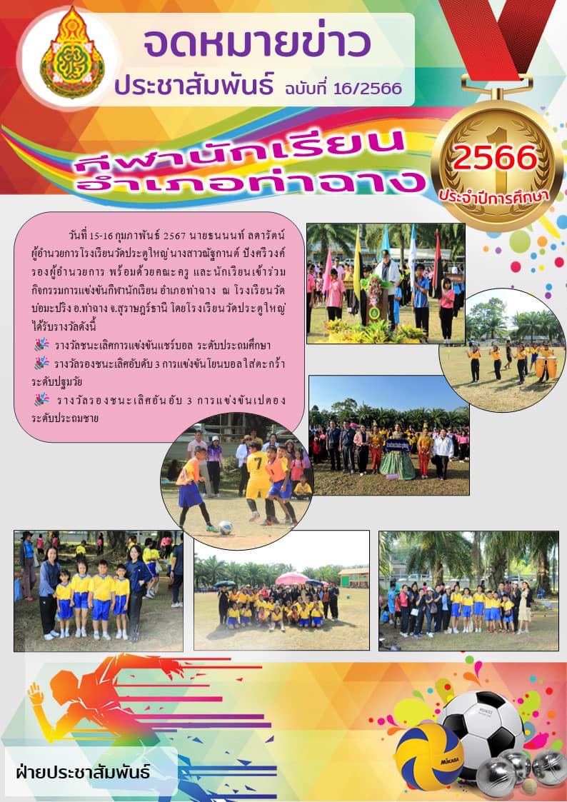วันที่ 15-16 กุมภาพันธ์ 2567 นายธนนนท์ ลดารัตน์ ผู้อำนวยการโรงเรียนวัดประตูใหญ่ นางสาวณัฐกานต์ ปังศรีวงค์ รองผู้อำนวยการ พร้อมด้วยคณะครู และนักเรียนเข้าร่วมกิจกรรมการแข่งขันกีฬานักเรียน อำเภอท่าฉาง ณ โรงเรียนวัดบ่อมะปริง อ.ท่าฉาง จ.สุราษฎร์ธานี โดยโรงเรียนวัดประตูใหญ่ได้รับถ้วยรางวัลดังนี้