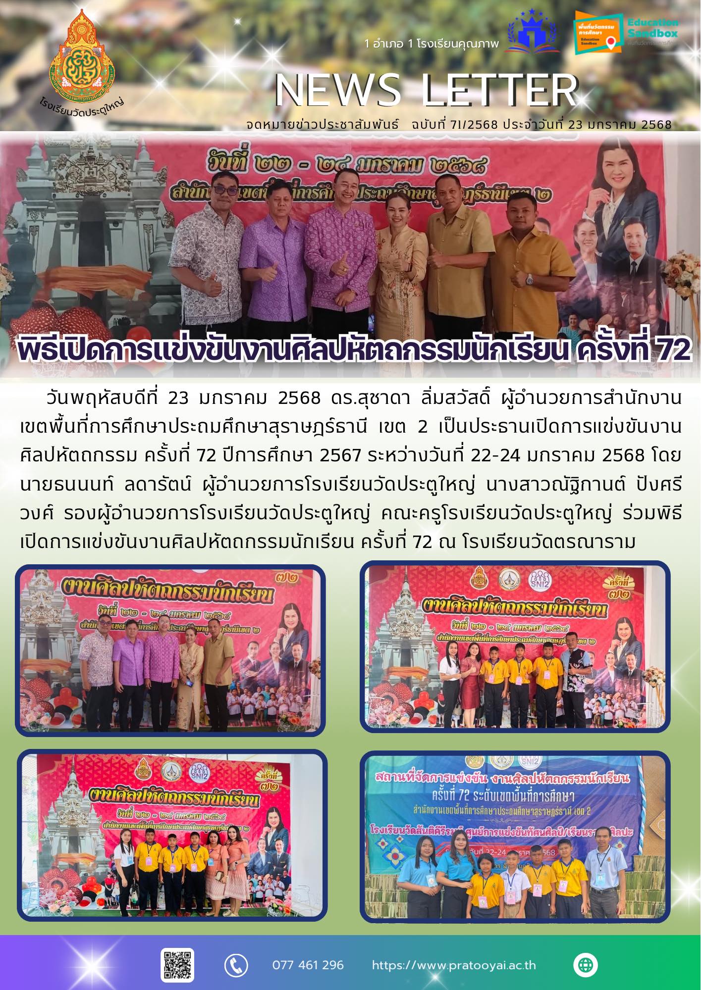 วันพฤหัสบดีที่ 23 มกราคม 2568 ดร.สุชาดา ลิ่มสวัสดิ์ ผู้อำนวยการสำนักงานเขตพื้นที่การศึกษาประถมศึกษาสุราษฎร์ธานี เขต 2 เป็นประธานเปิดการแข่งขันงานศิลปหัตถกรรม ครั้งที่ 72 ปีการศึกษา 2567 ระหว่างวันที่ 22-24 มกราคม 2568 โดยนายธนนนท์ ลดารัตน์ ผู้อำนวยการโรงเรียนวัดประตูใหญ่ นางสาวณัฐิกานต์ ปังศรีวงศ์ รองผู้อำนวยการโรงเรียนวัดประตูใหญ่ คณะครูโรงเรียนวัดประตูใหญ่ ร่วมพิธีเปิดการแข่งขันงานศิลปหัตถกรรมนักเรียน ครั้งที่ 72 ณ โรงเรียนวัดตรณาราม