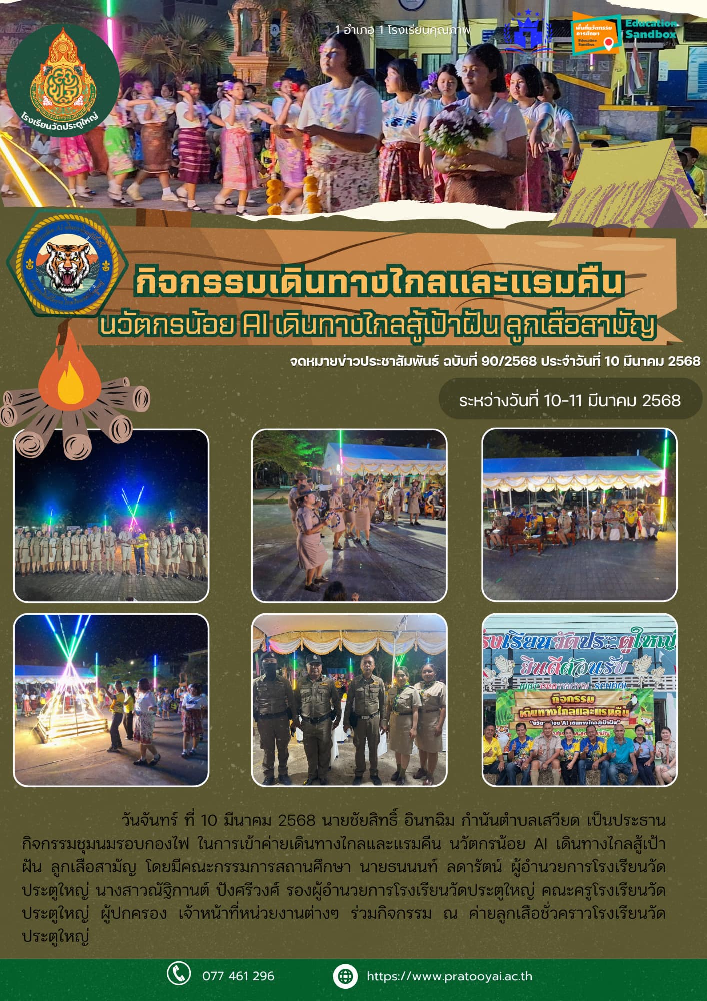 วันจันทร์ ที่ 10 มีนาคม 2568 นายชัยสิทธิ์ อินทฉิม กำนันตำบลเสวียด เป็นประธานกิจกรรมชุมนมรอบกองไฟ ในการเข้าค่ายเดินทางไกลและแรมคืน นวัตกรน้อย AI เดินทางไกลสู้เป้าฝัน ลูกเสือสามัญ โดยมีคณะกรรมการสถานศึกษา นายธนนนท์ ลดารัตน์ ผู้อำนวยการโรงเรียนวัดประตูใหญ่ นางสาวณัฐิกานต์ ปังศรีวงศ์ รองผู้อำนวยการโรงเรียนวัดประตูใหญ่ คณะครูโรงเรียนวัดประตูใหญ่ ผู้ปกครอง เจ้าหน้าที่หน่วยงานต่างๆ ร่วมกิจกรรม ณ ค่ายลูกเสือชั่วคราวโรงเรียนวัดประตูใหญ่