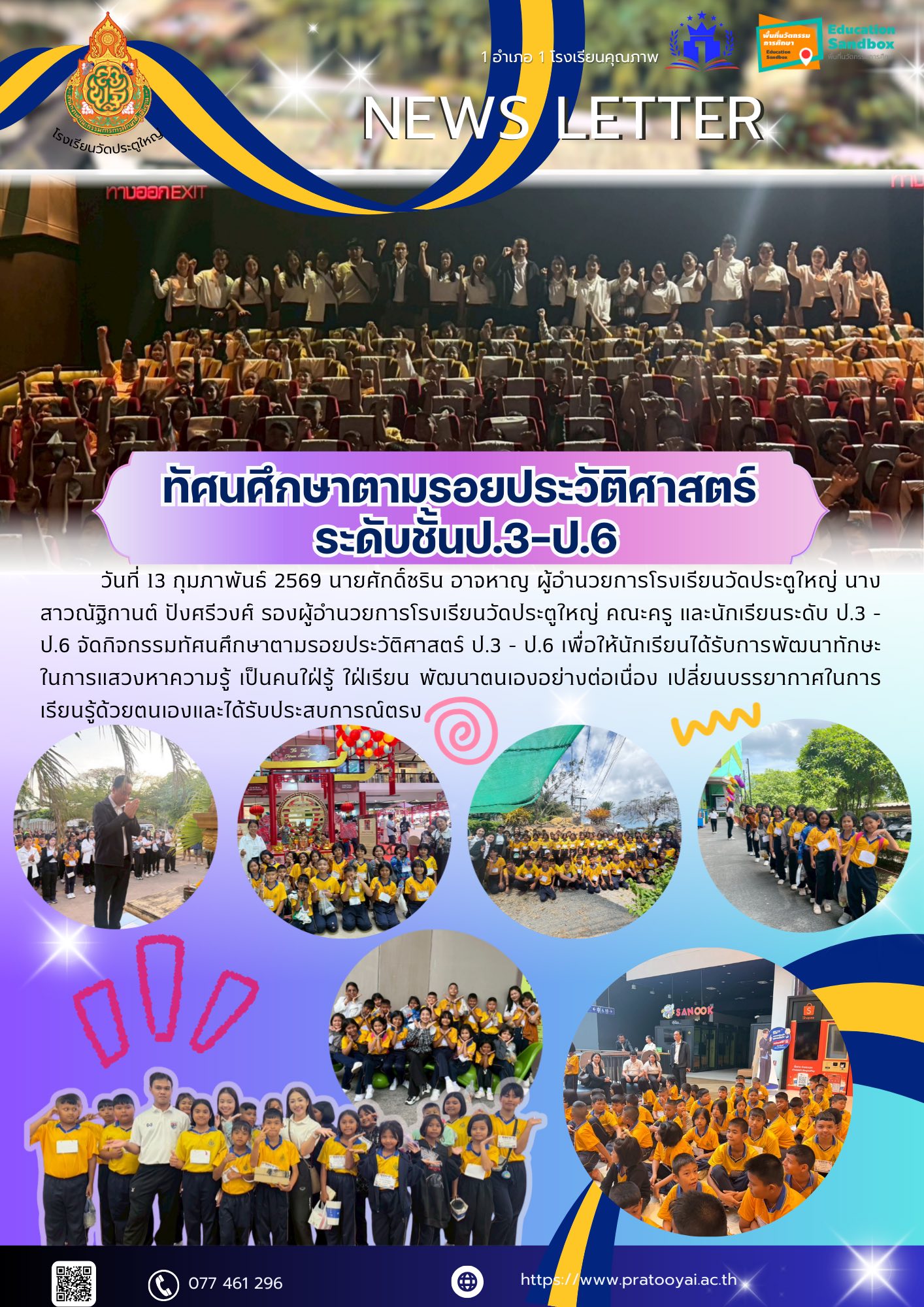 วันที่ 13 กุมภาพันธ์ 2569 นายศักดิ์ชริน อาจหาญ ผู้อำนวยการโรงเรียนวัดประตูใหญ่ นางสาวณัฐิกานต์ ปังศรีวงศ์ รองผู้อำนวยการโรงเรียนวัดประตูใหญ่ คณะครู และนักเรียนระดับ ป.3 - ป.6 จัดกิจกรรมทัศนศึกษาตามรอยประวัติศาสตร์ ป.3 - ป.6 เพื่อให้นักเรียนได้รับการพัฒนาทักษะในการแสวงหาความรู้ เป็นคนใฝ่รู้ ใฝ่เรียน พัฒนาตนเองอย่างต่อเนื่อง เปลี่ยนบรรยากาศในการเรียนรู้ด้วยตนเองและได้รับประสบการณ์ตรง