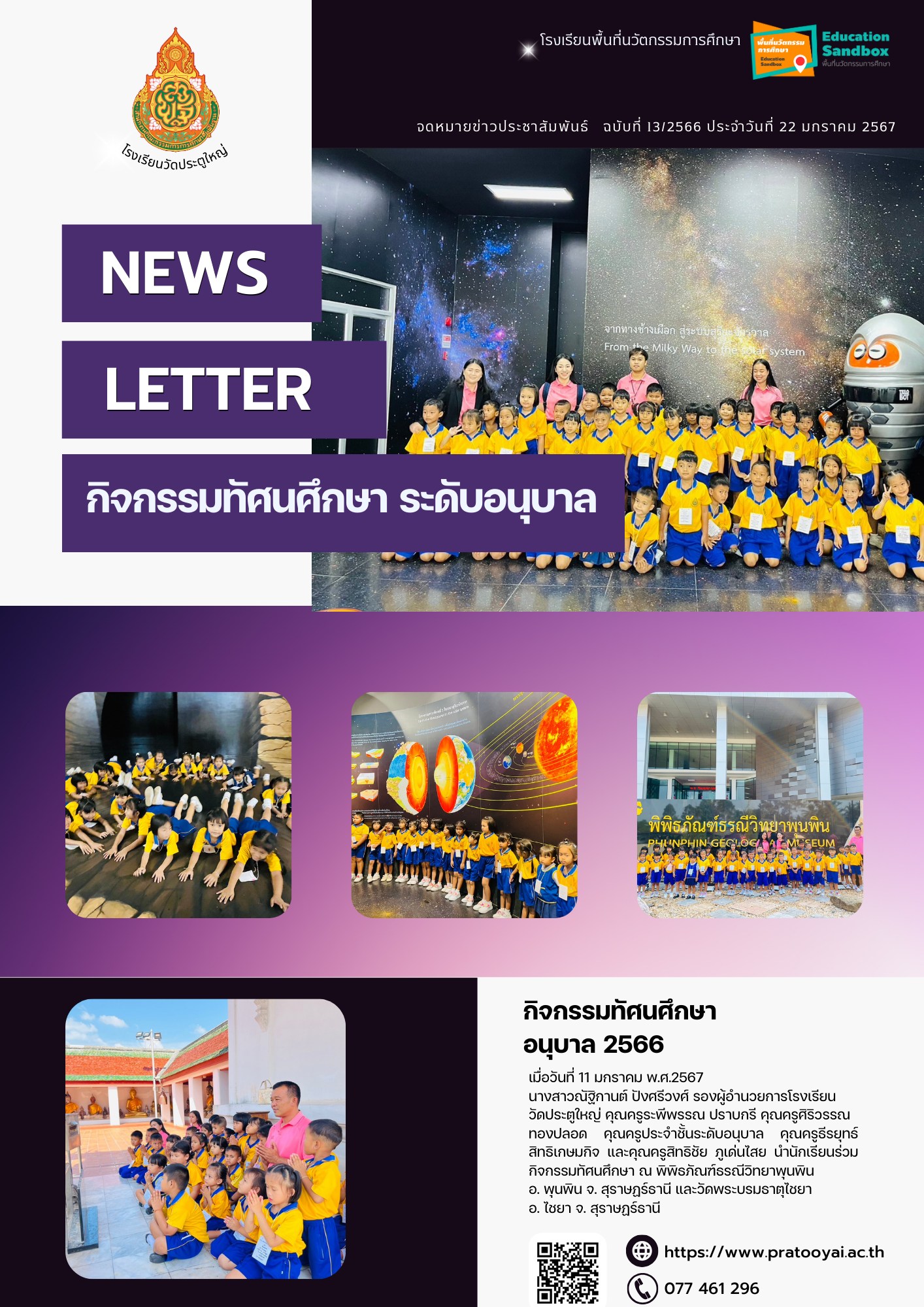 วัดประตูใหญ่ คุณครูระพีพรรณ ปราบกรี คุณครูศิริวรรณ ทองปลอด คุณครูประจำชั้นระดับอนุบาล คุณครูธีรยุทธ์ สิทธิเกษมกิจ และคุณครูสิทธิชัย ภูเด่นไสย นำนักเรียนร่วมกิจกรรมทัศนศึกษา ณ พิพิธภัณฑ์ธรณีวิทยาพุนพิน อ. พุนพิน จ. สุราษฏร์ธานี และวัดพระบรมธาตุไชยา