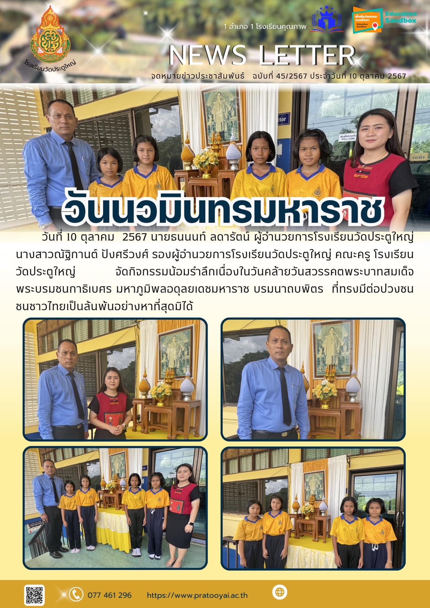 วันที่ 10 ตุลาคม 2567 นายธนนนท์ ลดารัตน์ ผู้อำนวยการโรงเรียนวัดประตูใหญ่ นางสาวณัฐิกานต์ ปังศรีวงศ์ รองผู้อำนวยการโรงเรียนวัดประตูใหญ่ คณะครู โรงเรียนวัดประตูใหญ่ จัดกิจกรรมน้อมรำลึกเนื่องในวันคล้ายวันสวรรคตพระบาทสมเด็จพระบรมชนกาธิเบศร มหาภูมิพลอดุลยเดชมหาราช บรมนาถบพิตร ที่ทรงมีต่อปวงชนชนชาวไทยเป็นล้นพ้นอย่างหาที่สุดมิได้
