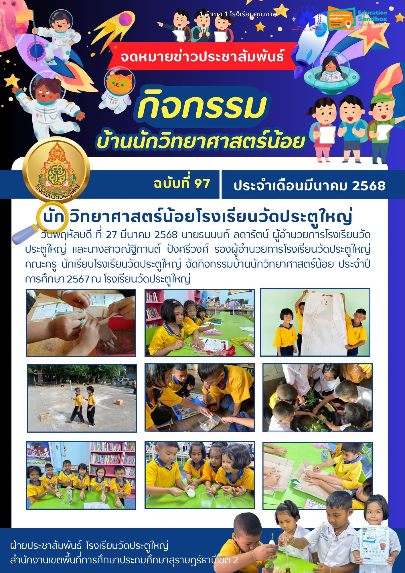 วันพฤหัสบดี ที่ 27 มีนาคม 2568 นายธนนนท์ ลดารัตน์ ผู้อำนวยการโรงเรียนวัดประตูใหญ่ และนางสาวณัฐิกานต์ ปังศรีวงศ์ รองผู้อำนวยการโรงเรียนวัดประตูใหญ่ คณะครู นักเรียนโรงเรียนวัดประตูใหญ่ จัดกิจกรรมบ้านนักวิทยาศาสตร์น้อย ประจำปีการศึกษา 2567 ณ โรงเรียนวัดประตูใหญ่