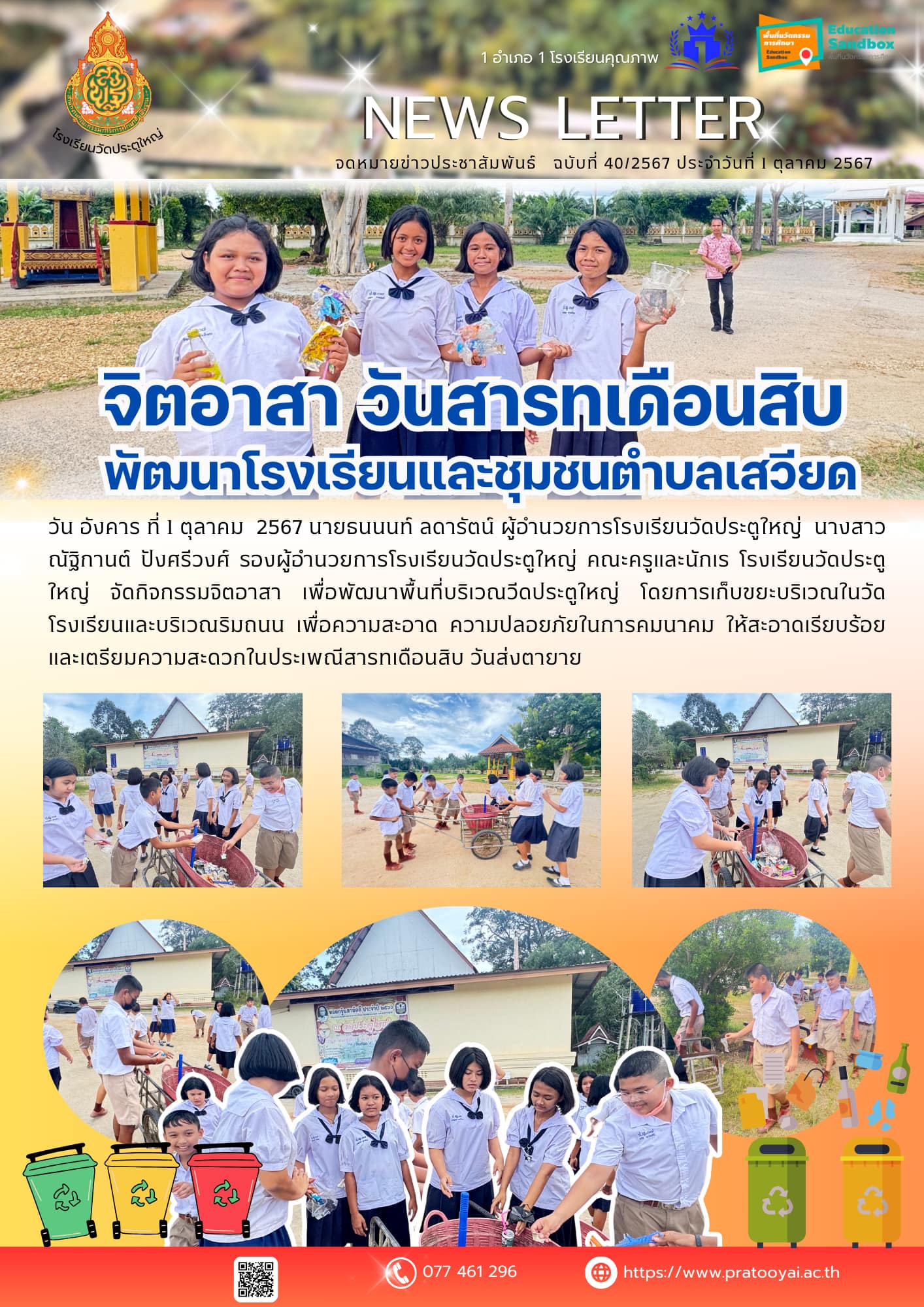 วัน อังคาร ที่ 1 ตุลาคม 2567 นายธนนนท์ ลดารัตน์ ผู้อำนวยการโรงเรียนวัดประตูใหญ่ นางสาวณัฐิกานต์ ปังศรีวงศ์ รองผู้อำนวยการโรงเรียนวัดประตูใหญ่ คณะครูและนักเรียน โรงเรียนวัดประตูใหญ่ จัดกิจกรรมจิตอาสา เพื่อพัฒนาพื้นที่บริเวณวัดประตูใหญ่ โดยการเก็บขยะบริเวณในวัด โรงเรียนและบริเวณริมถนน เพื่อความสะอาด ความปลอยภัยในการคมนาคม ให้สะอาดเรียบร้อย และเตรียมความสะดวกในประเพณีสารทเดือนสิบ วันส่งตายาย