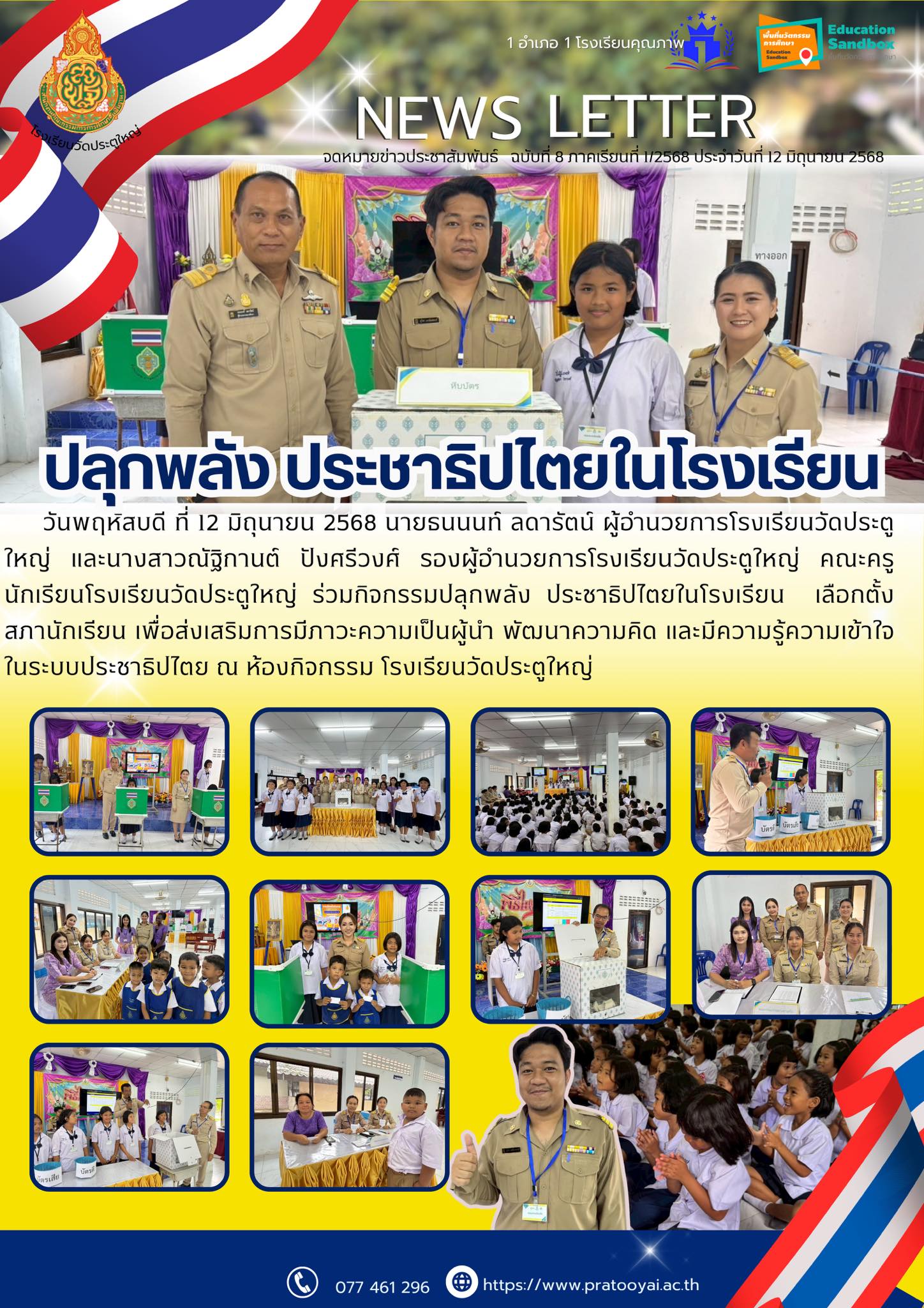 วันพฤหัสบดี ที่ 12 มิถุนายน 2568 นายธนนนท์ ลดารัตน์ ผู้อำนวยการโรงเรียนวัดประตูใหญ่ และนางสาวณัฐิกานต์ ปังศรีวงศ์ รองผู้อำนวยการโรงเรียนวัดประตูใหญ่ คณะครูนักเรียนโรงเรียนวัดประตูใหญ่ ร่วมกิจกรรมปลุกพลัง ประชาธิปไตยในโรงเรียน เลือกตั้งสภานักเรียน เพื่อส่งเสริมการมีภาวะความเป็นผู้นำ พัฒนาความคิด และมีความรู้ความเข้าใจในระบบประชาธิปไตย ณ ห้องกิจกรรม โรงเรียนวัดประตูใหญ่