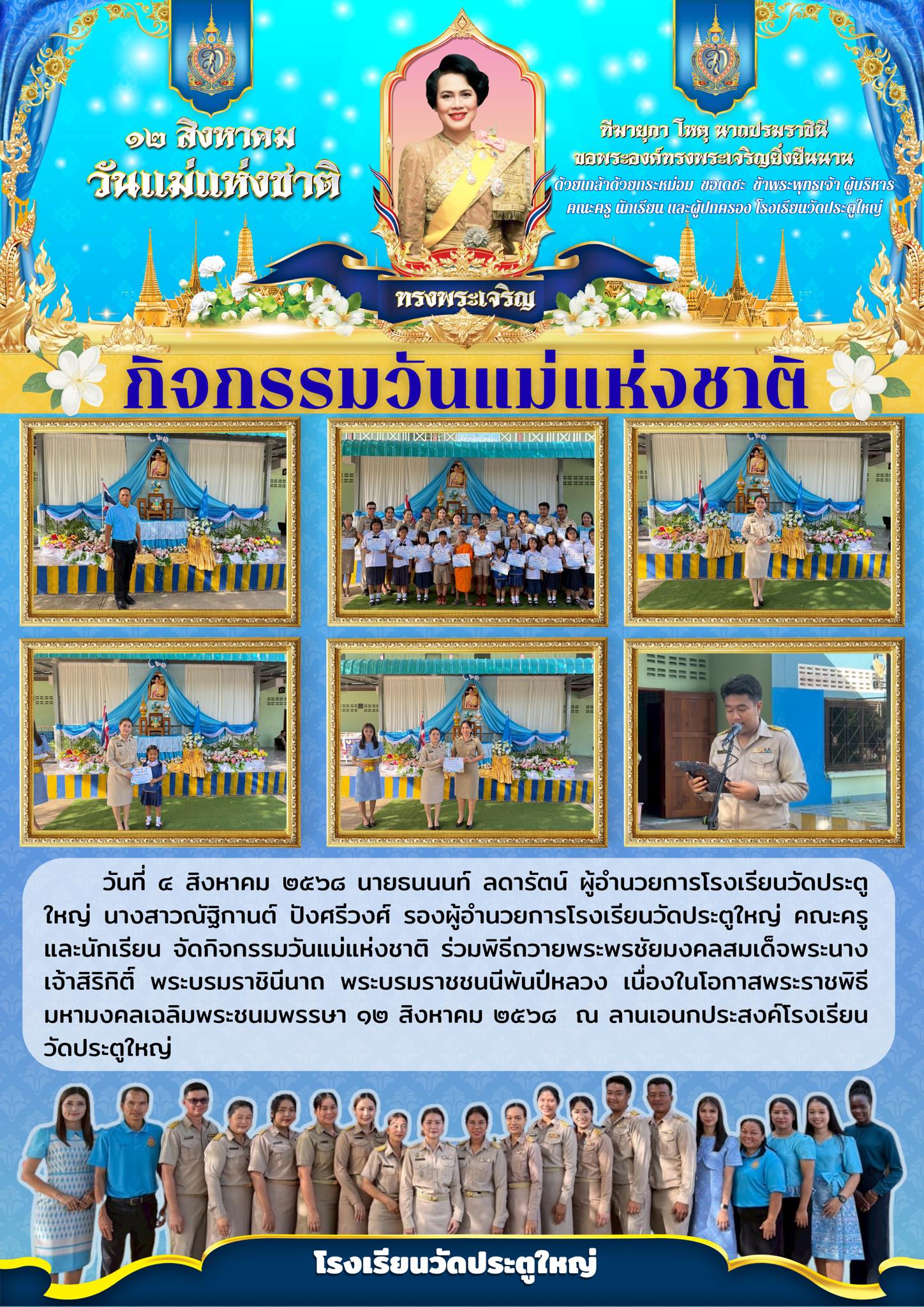 วันที่ ๔ สิงหาคม ๒๕๖๘ นายธนนนท์ ลดารัตน์ ผู้อำนวยการโรงเรียนวัดประตูใหญ่ นางสาวณัฐิกานต์ ปังศรีวงศ์ รองผู้อำนวยการโรงเรียนวัดประตูใหญ่ คณะครู และนักเรียน จัดกิจกรรมวันแม่แห่งชาติ ร่วมพิธีถวายพระพรชัยมงคลสมเด็จพระนางเจ้าสิริกิติ์ พระบรมราชินีนาถ พระบรมราชชนนีพันปีหลวง เนื่องในโอกาสพระราชพิธีมหามงคลเฉลิมพระชนมพรรษา ๑๒ สิงหาคม ๒๕๖๘ ณ ลานเอนกประสงค์โรงเรียนวัดประตูใหญ่