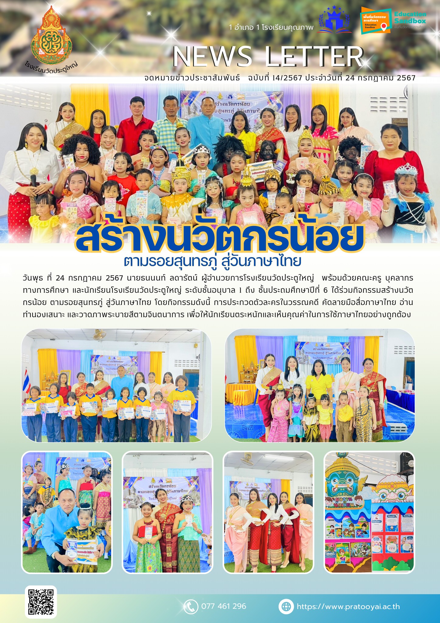 วันพุธ ที่ 24 กรกฎาคม 2567 นายธนนนท์ ลดารัตน์ ผู้อำนวยการโรงเรียนวัดประตูใหญ่ พร้อมด้วยคณะครู บุคลากรทางการศึกษา และนักเรียนโรงเรียนวัดประตูใหญ่ ระดับชั้นอนุบาล 1 ถึง ชั้นประถมศึกษาปีที่ 6 ได้ร่วมกิจกรรมสร้างนวัตกรน้อย ตามรอยสุนทรภู่ สู่วันภาษาไทย โดยกิจกรรมดังนี้ การประกวดตัวละครในวรรณคดี คัดลายมือสื่อภาษาไทย อ่านทำนองเสนาะ และวาดภาพระบายสีตามจินตนาการ เพื่อให้นักเรียนตระหนักและเห็นคุณค่าในการใช้ภาษาไทยอย่างถูกต้อง
