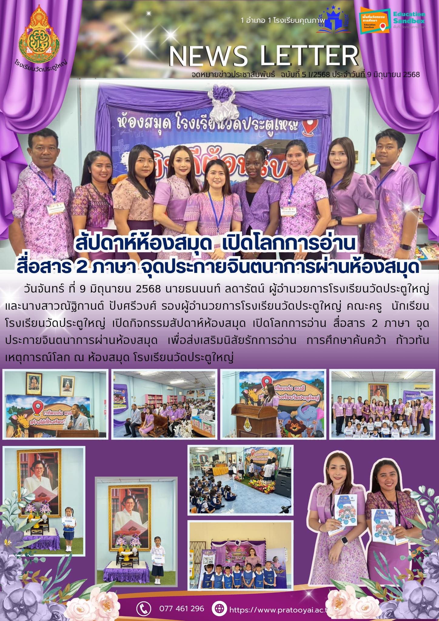 วันจันทร์ ที่ 9 มิถุนายน 2568 นายธนนนท์ ลดารัตน์ ผู้อำนวยการโรงเรียนวัดประตูใหญ่ และนางสาวณัฐิกานต์ ปังศรีวงศ์ รองผู้อำนวยการโรงเรียนวัดประตูใหญ่ คณะครู นักเรียนโรงเรียนวัดประตูใหญ่ เปิดกิจกรรมสัปดาห์ห้องสมุด เปิดโลกการอ่าน สื่อสาร 2 ภาษา จุดประกายจินตนาการผ่านห้องสมุด เพื่อส่งเสริมนิสัยรักการอ่าน การศึกษาค้นคว้า ก้าวทันเหตุการณ์โลก ณ ห้องสมุด โรงเรียนวัดประตูใหญ่