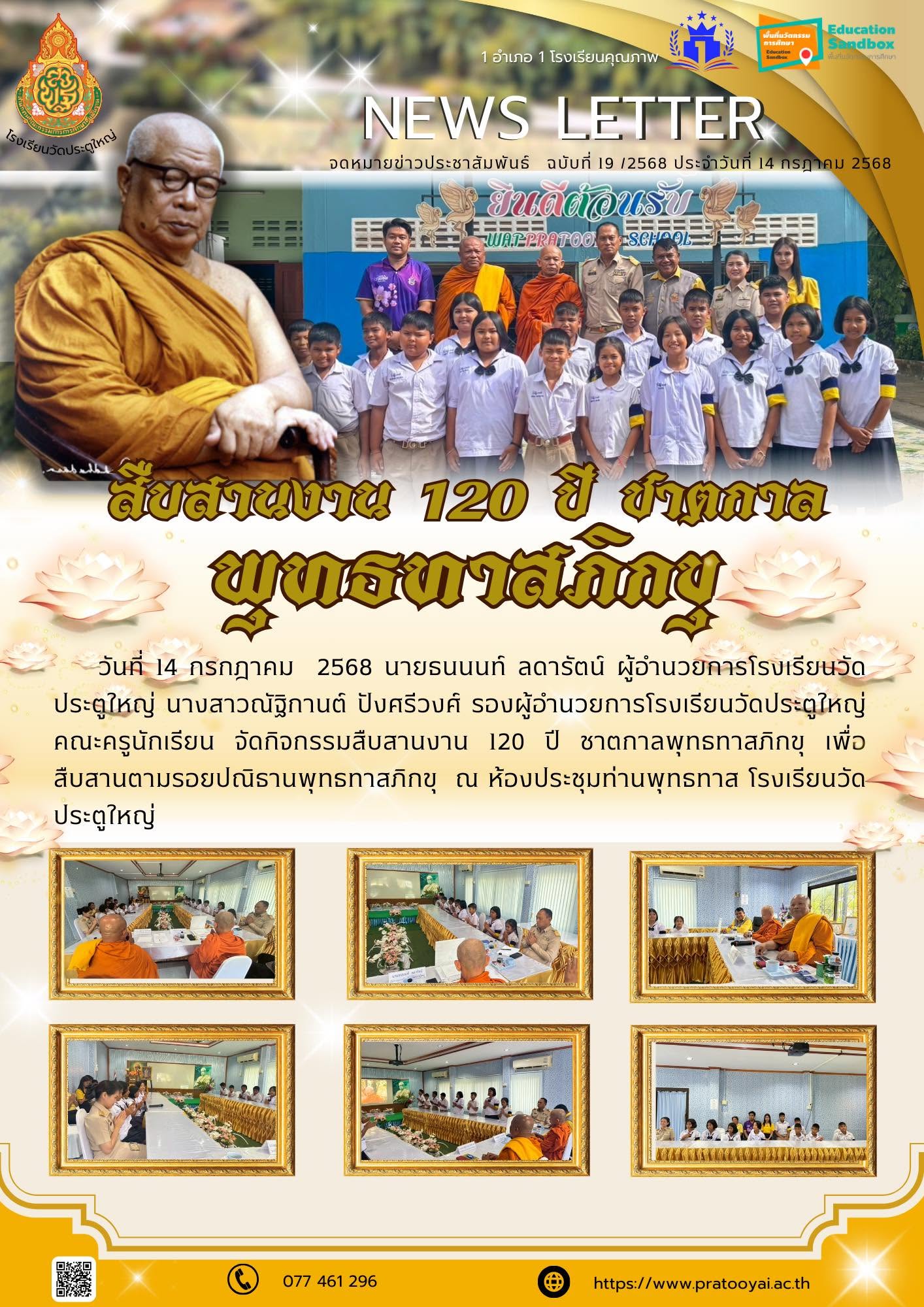 วันที่ 14 กรกฎาคม 2568 นายธนนนท์ ลดารัตน์ ผู้อำนวยการโรงเรียนวัดประตูใหญ่ นางสาวณัฐิกานต์ ปังศรีวงศ์ รองผู้อำนวยการโรงเรียนวัดประตูใหญ่ คณะครูนักเรียน จัดกิจกรรมสืบสานงาน 120 ปี ชาตกาลพุทธทาสภิกขุ เพื่อสืบสานตามรอยปณิธานพุทธทาสภิกขุ ณ ห้องประชุมท่านพุทธทาส โรงเรียนวัดประตูใหญ่