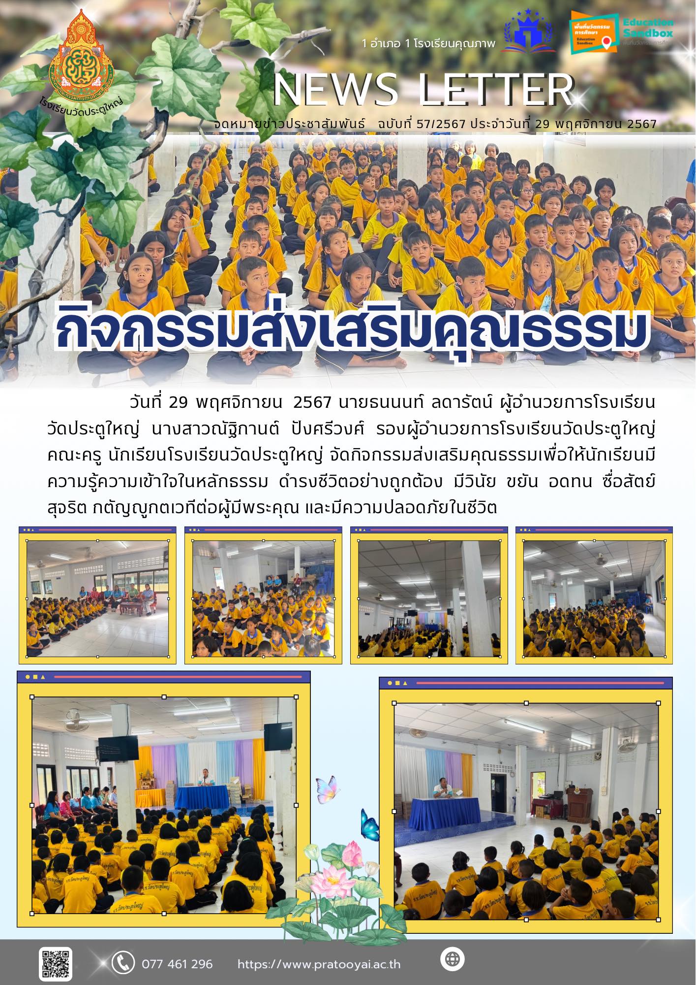 วันที่ 29 พฤศจิกายน 2567 นายธนนนท์ ลดารัตน์ ผู้อำนวยการโรงเรียนวัดประตูใหญ่ นางสาวณัฐิกานต์ ปังศรีวงศ์ รองผู้อำนวยการโรงเรียนวัดประตูใหญ่คณะครู นักเรียนโรงเรียนวัดประตูใหญ่ จัดกิจกรรมส่งเสริมคุณธรรมเพื่อให้นักเรียนมีความรู้ความเข้าใจในหลักธรรม ดำรงชีวิตอย่างถูกต้อง มีวินัย ขยัน อดทน ซื่อสัตย์สุจริต กตัญญูกตเวทีต่อผู้มีพระคุณ และมีความปลอดภัยในชีวิต