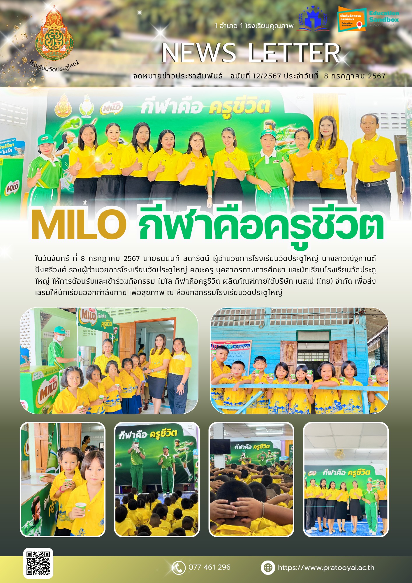 วันจันทร์ ที่ 8 กรกฎาคม 2567 นายธนนนท์ ลดารัตน์ ผู้อำนวยการโรงเรียนวัดประตูใหญ่ นางสาวณัฐิกานต์ ปังศรีวงศ์ รองผู้อำนวยการโรงเรียนวัดประตูใหญ่ คณะครู บุคลากรทางการศึกษา และนักเรียนโรงเรียนวัดประตูใหญ่ ให้การต้อนรับและเข้าร่วมกิจกรรม ไมโล กีฬาคือครูชีวิต ผลิตภัณฑ์ภายใต้บริษัท เนสเน่ (ไทย) จำกัด เพื่อส่งเสริมให้นักเรียนออกกำลังกาย เพื่อสุขภาพ ณ ห้องกิจกรรมโรงเรียนวัดประตูใหญ่