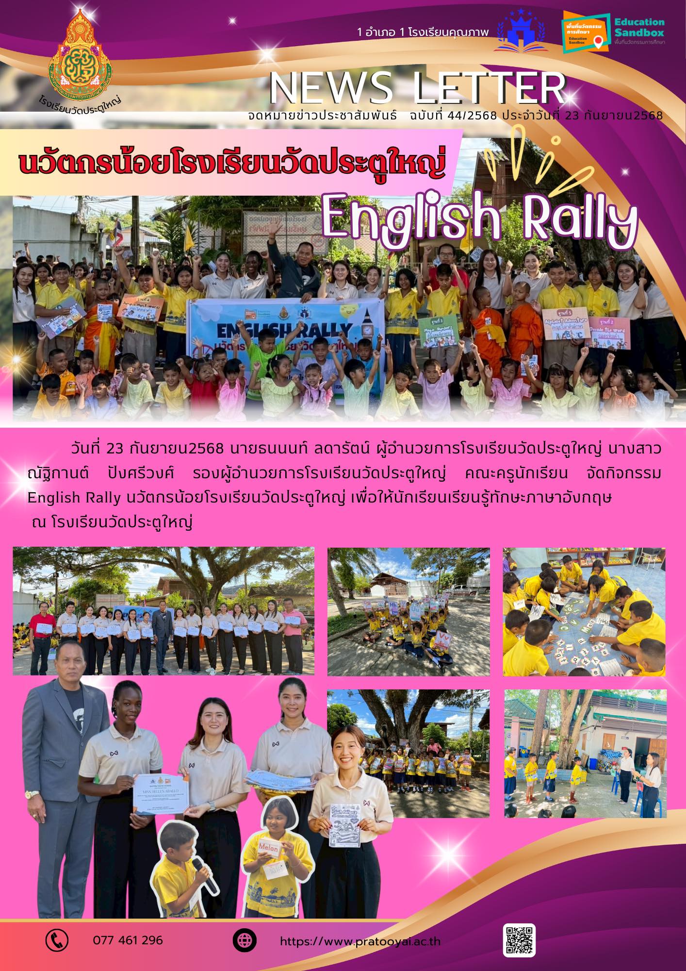 วันที่ 23 กันยายน2568 นายธนนนท์ ลดารัตน์ ผู้อำนวยการโรงเรียนวัดประตูใหญ่ นางสาวณัฐิกานต์ ปังศรีวงศ์ รองผู้อำนวยการโรงเรียนวัดประตูใหญ่ คณะครูนักเรียน จัดกิจกรรม English Rally นวัตกรน้อยโรงเรียนวัดประตูใหญ่ เพื่อให้นักเรียนเรียนรู้ทักษะภาษาอังกฤษ