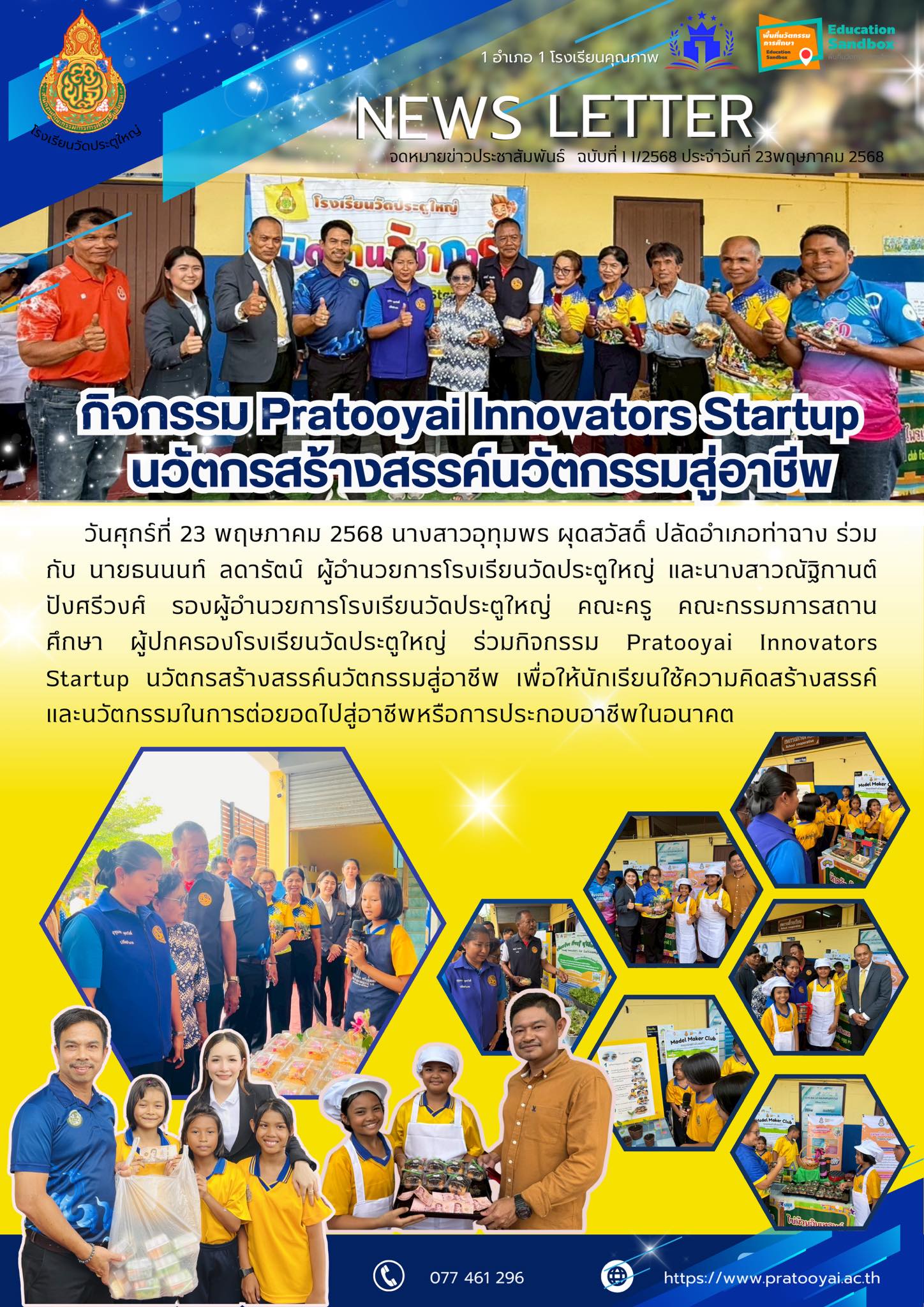 วันศุกร์ที่ 23 พฤษภาคม 2568 นางสาวอุทุมพร ผุดสวัสดิ์ ปลัดอำเภอท่าฉาง ร่วมกับ นายธนนนท์ ลดารัตน์ ผู้อำนวยการโรงเรียนวัดประตูใหญ่ และนางสาวณัฐิกานต์ ปังศรีวงศ์ รองผู้อำนวยการโรงเรียนวัดประตูใหญ่ คณะครู คณะกรรมการสถานศึกษา ผู้ปกครองโรงเรียนวัดประตูใหญ่ ร่วมกิจกรรม Pratooyai Innovators Startup นวัตกรสร้างสรรค์นวัตกรรมสู่อาชีพ เพื่อให้นักเรียนใช้ความคิดสร้างสรรค์และนวัตกรรมในการต่อยอดไปสู่อาชีพหรือการประกอบอาชีพในอนาคต