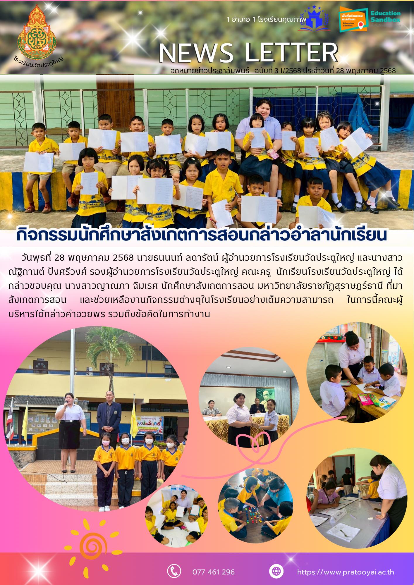 วันพุธที่ 28 พฤษภาคม 2568 นายธนนนท์ ลดารัตน์ ผู้อำนวยการโรงเรียนวัดประตูใหญ่ และนางสาวณัฐิกานต์ ปังศรีวงศ์ รองผู้อำนวยการโรงเรียนวัดประตูใหญ่ คณะครู นักเรียนโรงเรียนวัดประตูใหญ่ ได้กล่าวขอบคุณ นางสาวญาณภา ฉิมเรศ นักศึกษาสังเกตการสอน มหาวิทยาลัยราชภัฏสุราษฎร์ธานี ที่มาสังเกตการสอน และช่วยเหลืองานกิจกรรมต่างๆในโรงเรียนอย่างเต็มความสามารถ ในการนี้คณะผู้บริหารได้กล่าวคำอวยพร รวมถึงข้อคิดในการทำงาน