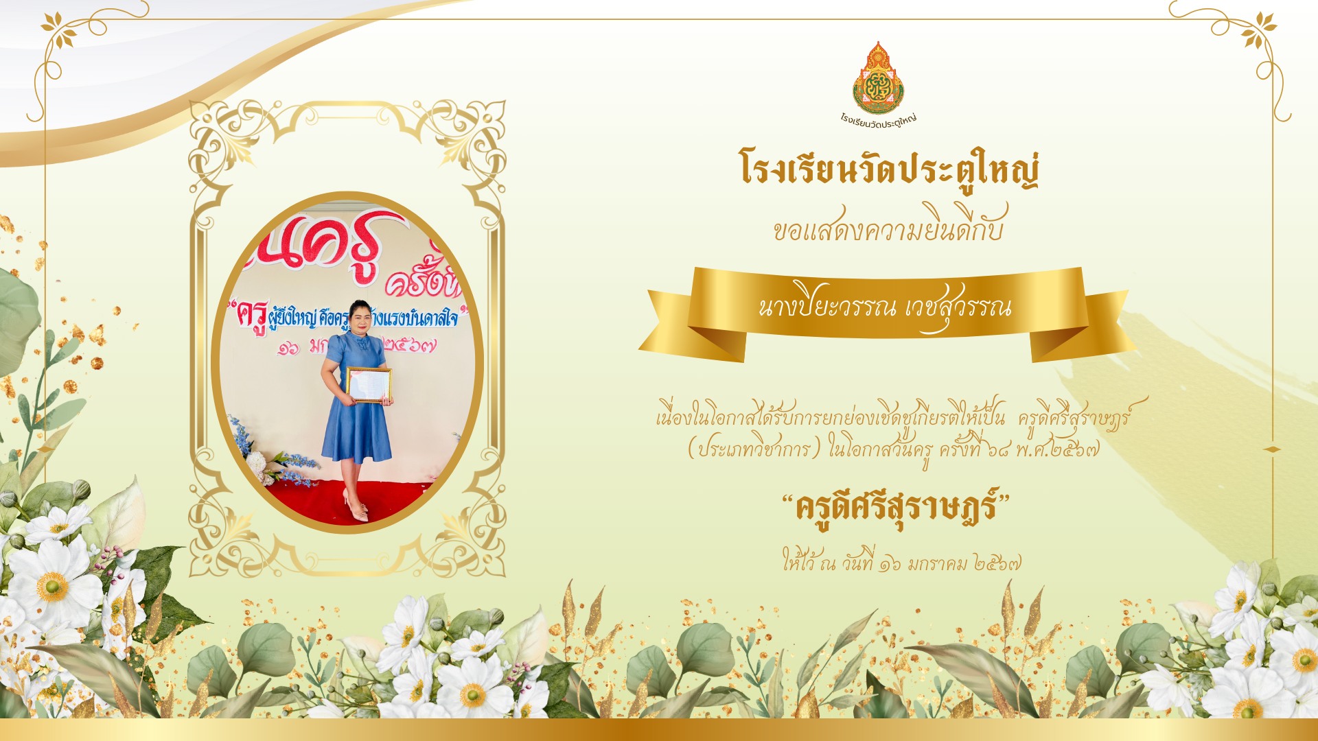 โรงเรียนวัดประตูใหญ่ ขอแสดงความยินดีกับ นางปิยะวรรณ เวชสุวรรณ เนื่องในโอกาสได้รับการยกย่องเชิดชูเกียรติให้เป็น "ครูดีศรีสุราษฎร์"