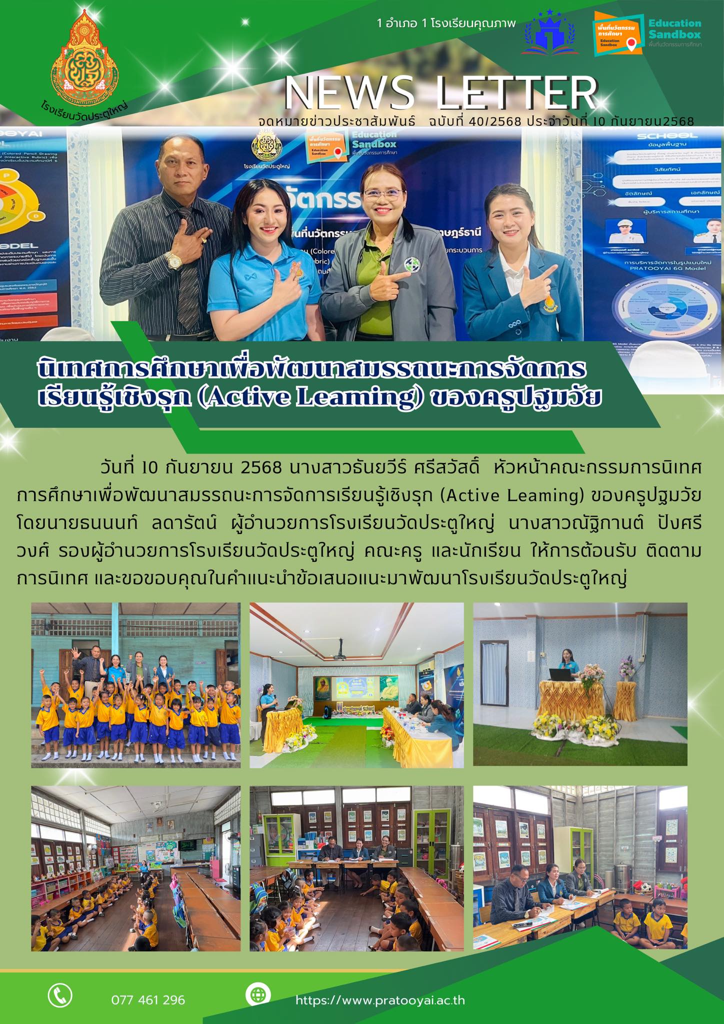 วันที่ 10 กันยายน 2568 นางสาวธันยวีร์ ศรีสวัสดิ์ หัวหน้าคณะกรรมการนิเทศการศึกษาเพื่อพัฒนาสมรรถนะการจัดการเรียนรู้เชิงรุก (Active Leaming) ของครูปฐมวัย โดยนายธนนนท์ ลดารัตน์ ผู้อำนวยการโรงเรียนวัดประตูใหญ่ นางสาวณัฐิกานต์ ปังศรีวงศ์ รองผู้อำนวยการโรงเรียนวัดประตูใหญ่ คณะครู และนักเรียน ให้การต้อนรับ ติดตามการนิเทศ และขอขอบคุณในคำแนะนำข้อเสนอแนะมาพัฒนาโรงเรียนวัดประตูใหญ่