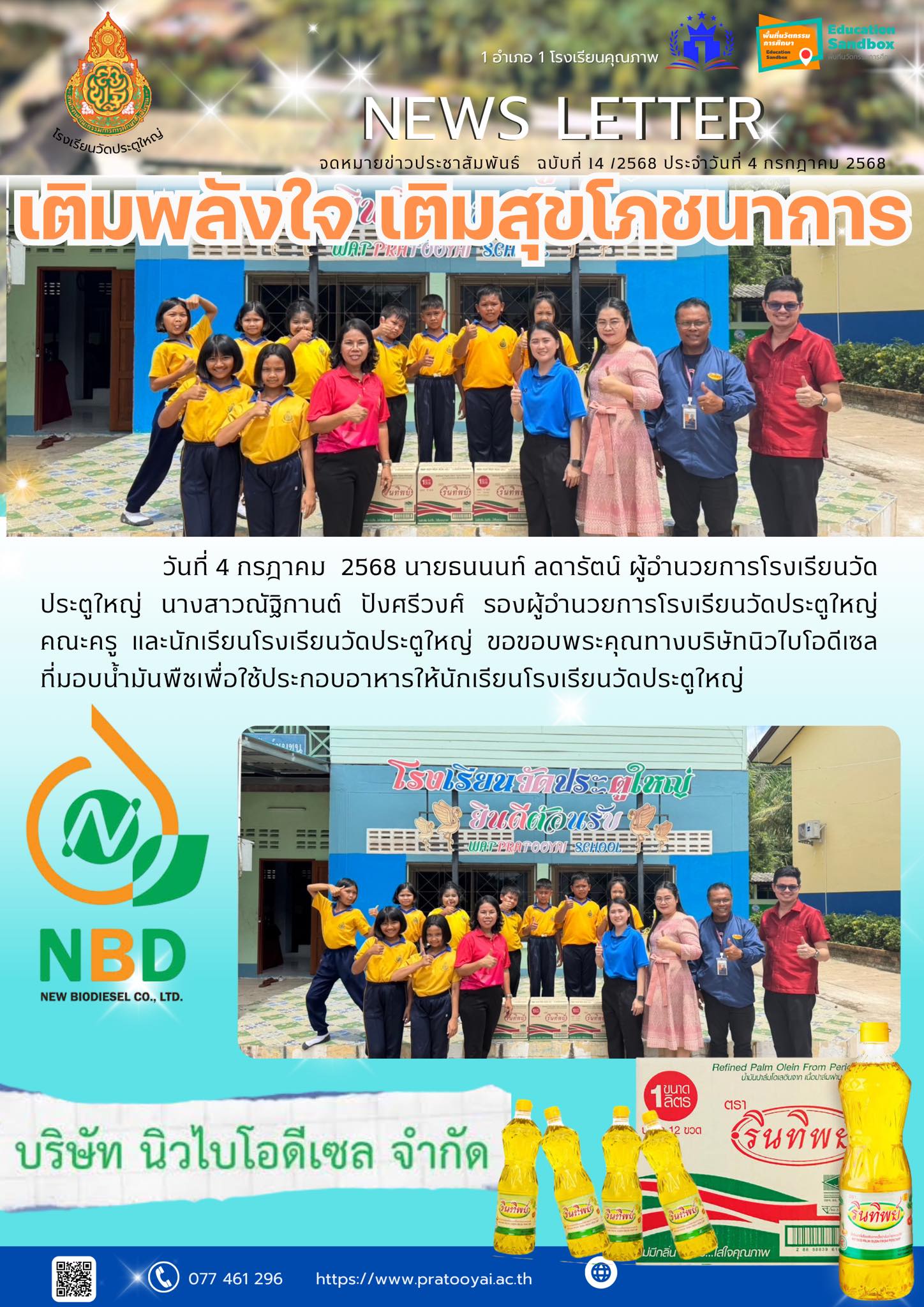 วันที่ 4 กรฎาคม 2568 นายธนนนท์ ลดารัตน์ ผู้อำนวยการโรงเรียนวัดประตูใหญ่ นางสาวณัฐิกานต์ ปังศรีวงศ์ รองผู้อำนวยการโรงเรียนวัดประตูใหญ่ คณะครู และนักเรียนโรงเรียนวัดประตูใหญ่ ขอขอบพระคุณทางบริษัทนิวไบโอดีเซลที่มอบน้ำมันพืชเพื่อใช้ประกอบอาหารให้นักเรียนโรงเรียนวัดประตูใหญ่