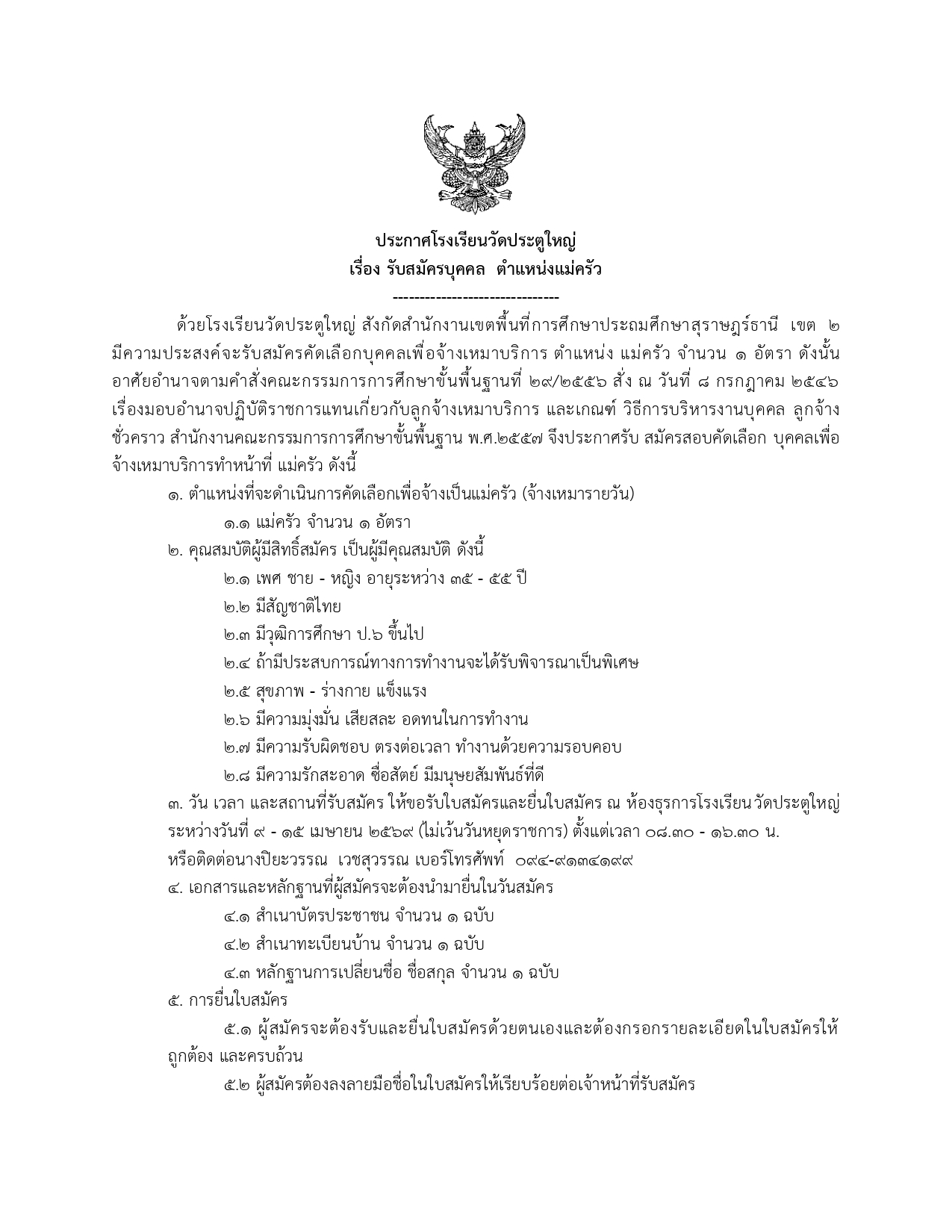 ด้วยโรงเรียนวัดประตูใหญ่ สังกัดสำนักงานเขตพื้นที่การศึกษาประถมศึกษาสุราษฎร์ธานี เขต 2 มีความประสงค์จะรับสมัครคัดเลือกบุคคลเพื่อจ้างเหมาบริการ ตำแหน่ง แม่ครัว จำนวน 1 อัตรา ดังนั้น อาศัยอำนาจตามคำสั่งคณะกรรมการการศึกษาขั้นพื้นฐานที่ 29/2556 สั่ง ณ วันที่ 8 กรกฎาคม 2546 เรื่องมอบอำนาจปฏิบัติราชการแทนเกี่ยวกับลูกจ้างเหมาบริการ และเกณฑ์ วิธีการบริหารงานบุคคล ลูกจ้างชั่วคราว สำนักงานคณะกรรมการการศึกษาขั้นพื้นฐาน พ.ศ. 2557 จึงประกาศรับสมัครสอบคัดเลือกบุคคลเพื่อจ้างเหมาบริการทำหน้าที่ แม่ครัว ดังนี้