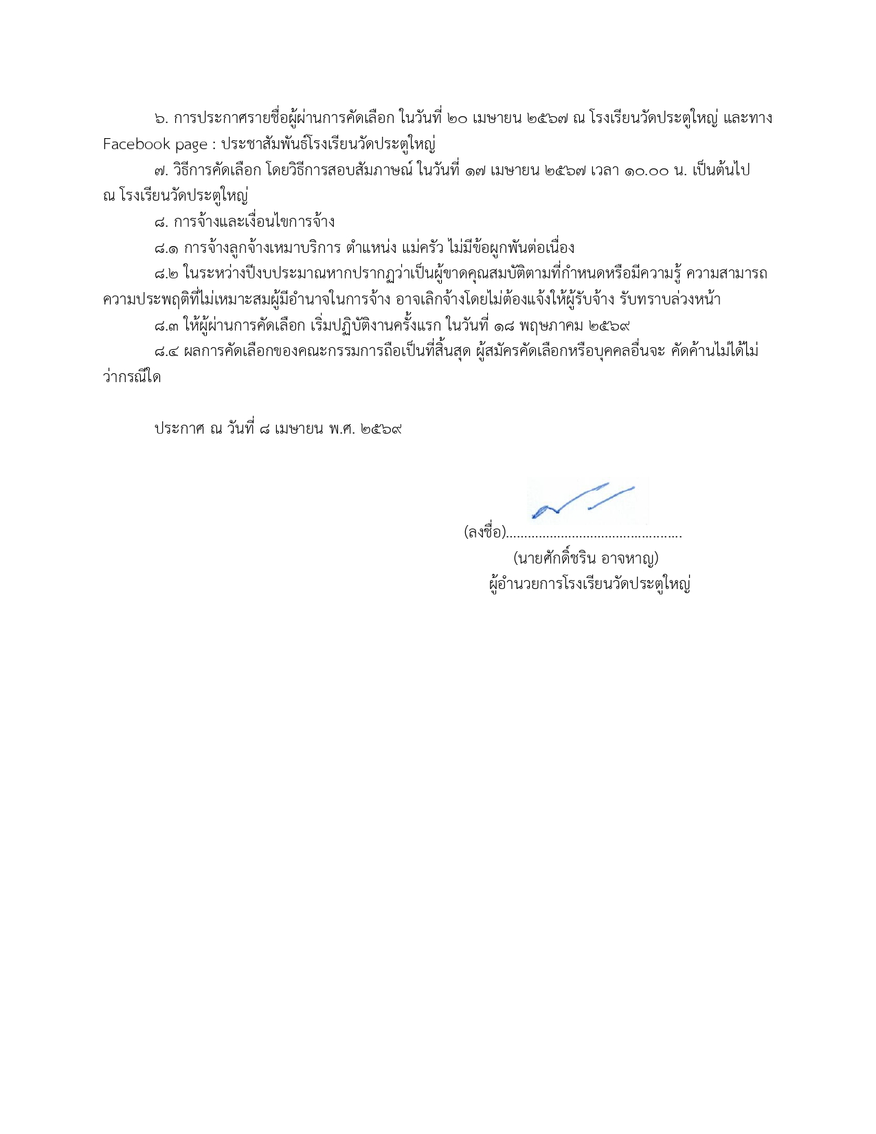 7. วิธีการคัดเลือก โดยวิธีการสอบสัมภาษณ์ ในวันที่ 17 เมษายน 2569 เวลา 10.00 น. เป็นต้นไป ณ โรงเรียนวัดประตูใหญ่