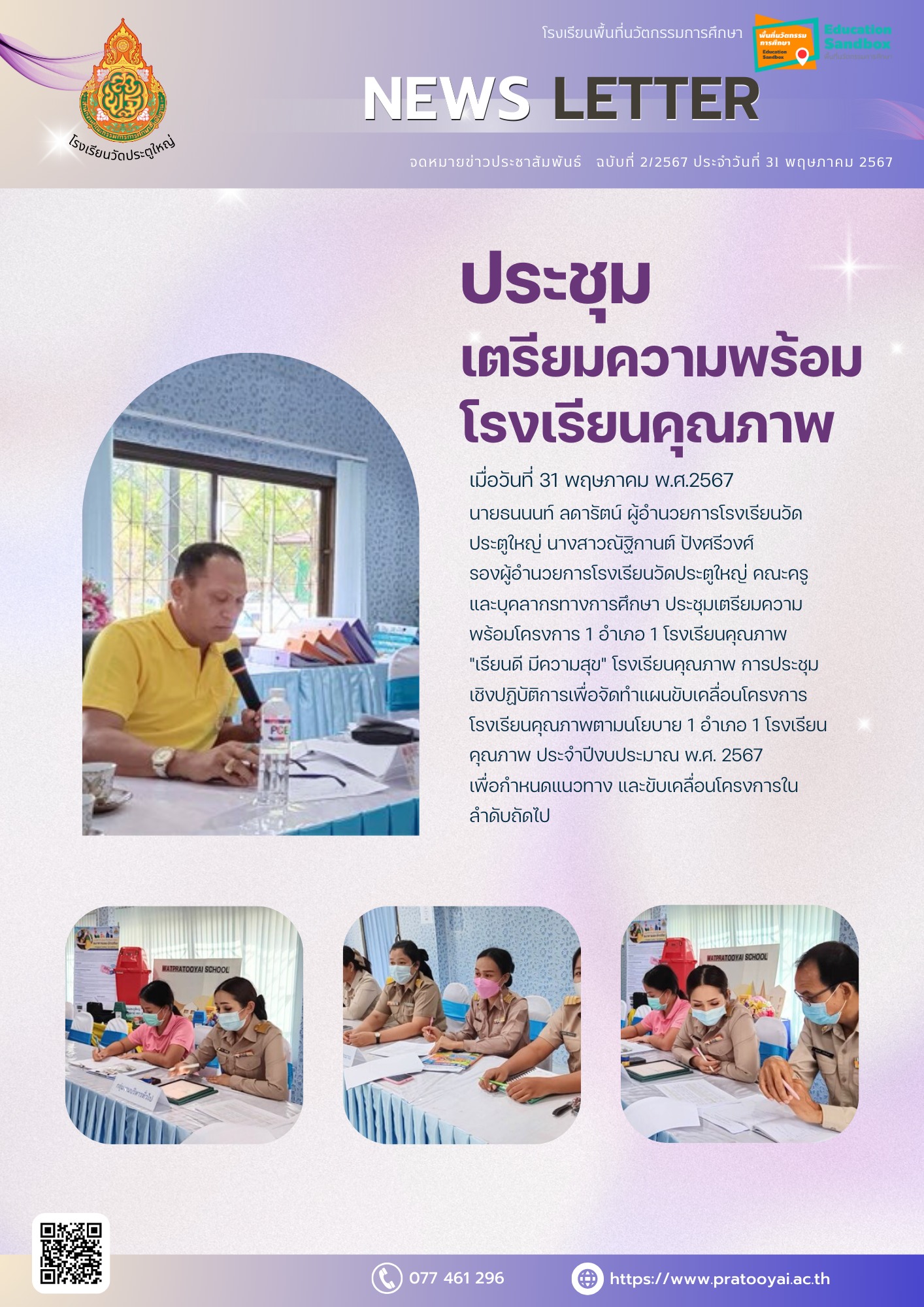 มื่อวันที่ 31 พฤษภาคม พ.ศ.2567 นายธนนนท์ ลดารัตน์ ผู้อำนวยการโรงเรียนวัดประตูใหญ่ นางสาวณัฐิกานต์ ปังศรีวงศ์ รองผู้อำนวยการโรงเรียนวัดประตูใหญ่ คณะครูและบุคลากรทางการศึกษา ประชุมเตรียมความพร้อมโครงการ 1 อำเภอ 1 โรงเรียนคุณภาพ "เรียนดี มีความสุข" โรงเรียนคุณภาพ การประชุมเชิงปฏิบัติการเพื่อจัดทำแผนขับเคลื่อนโครงการโรงเรียนคุณภาพตามนโยบาย 1 อำเภอ 1 โรงเรียนคุณภาพ ประจำปีงบประมาณ พ.ศ. 2567 เพื่อกำหนดแนวทาง และขับเคลื่อนโครงการในลำดับถัดไป