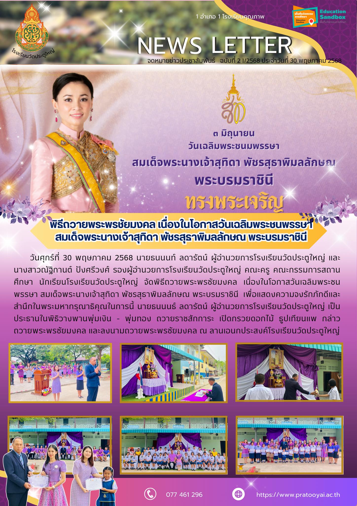 วันศุกร์ที่ 30 พฤษภาคม 2568 นายธนนนท์ ลดารัตน์ ผู้อำนวยการโรงเรียนวัดประตูใหญ่ และนางสาวณัฐิกานต์ ปังศรีวงศ์ รองผู้อำนวยการโรงเรียนวัดประตูใหญ่ คณะครู คณะกรรมการสถานศึกษา นักเรียนโรงเรียนวัดประตูใหญ่ จัดพิธีถวายพระพรชัยมงคล เนื่องในโอกาสวันเฉลิมพระชนพรรษา สมเด็จพระนางเจ้าสุทิดา พัชรสุธาพิมลลักษณ พระบรมราชินี เพื่อแสดงความจงรักภักดีและสำนึกในพระมหากรุณาธิคุณในการนี้ นายธนนนธ์ ลดารัตน์ ผู้อำนวยการโรงเรียนวัดประตูใหญ่ เป็นประธานในพิธิวางพานพุ่มเงิน - พุ่มทอง ถวายราชสักการะ เปิดกรวยดอกไม้ ธูปเทียนแพ กล่าวถวายพระพรชัยมงคล และลงนามถวายพระพรชัยมงคล ณ ลานเอนกประสงค์โรงเรียนวัดประตูใหญ่