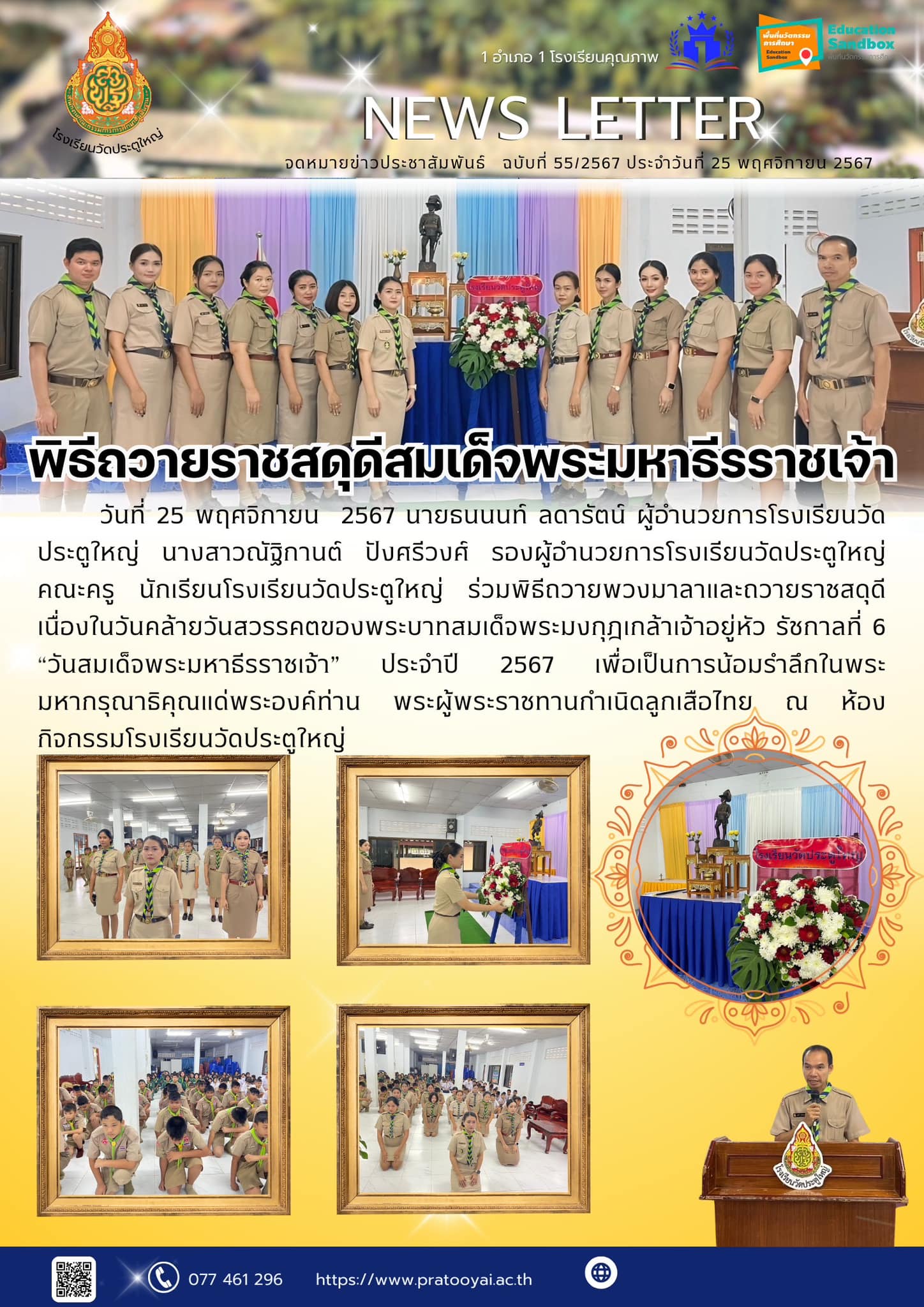วันที่ 25 พฤศจิกายน 2567 นายธนนนท์ ลดารัตน์ ผู้อำนวยการโรงเรียนวัดประตูใหญ่ นางสาวณัฐิกานต์ ปังศรีวงศ์ รองผู้อำนวยการโรงเรียนวัดประตูใหญ่คณะครู นักเรียนโรงเรียนวัดประตูใหญ่ ร่วมพิธีถวายพวงมาลาและถวายราชสดุดี เนื่องในวันคล้ายวันสวรรคตของพระบาทสมเด็จพระมงกุฎเกล้าเจ้าอยู่หัว รัชกาลที่ 6 “วันสมเด็จพระมหาธีรราชเจ้า” ประจำปี 2567 เพื่อเป็นการน้อมรำลึกในพระมหากรุณาธิคุณแด่พระองค์ท่าน พระผู้พระราชทานกำเนิดลูกเสือไทย ณ ห้องกิจกรรมโรงเรียนวัดประตูใหญ่