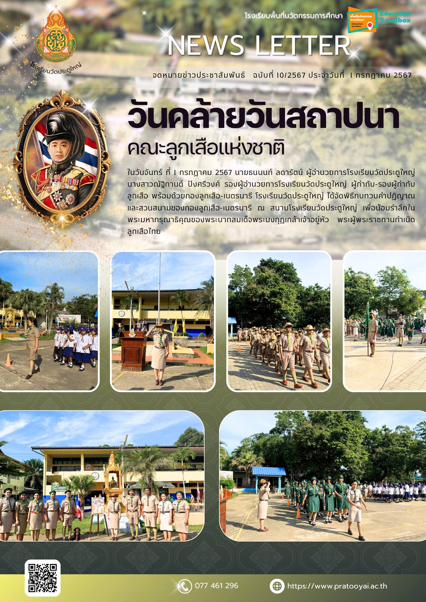 ในวันจันทร์ ที่ 1 กรกฎาคม 2567 นายธนนนท์ ลดารัตน์ ผู้อำนวยการโรงเรียนวัดประตูใหญ่ นางสาวณัฐิกานต์ ปังศรีวงศ์ รองผู้อำนวยการโรงเรียนวัดประตูใหญ่ ผู้กำกับ-รองผู้กำกับลูกเสือ พร้อมด้วยกองลูกเสือ-เนตรนารี โรงเรียนวัดประตูใหญ่ ได้จัดพิธีทบทวนคำปฏิญาณ และสวนสนามของกองลูกเสือ-เนตรนารี ณ สนามโรงเรียนวัดประตูใหญ่ เพื่อน้อมรำลึกในพระมหากรุณาธิคุณของพระบาทสมเด็จพระมงกุฎเกล้าเจ้าอยู่หัว พระผู้พระราชทานกำเนิดลูกเสือไทย