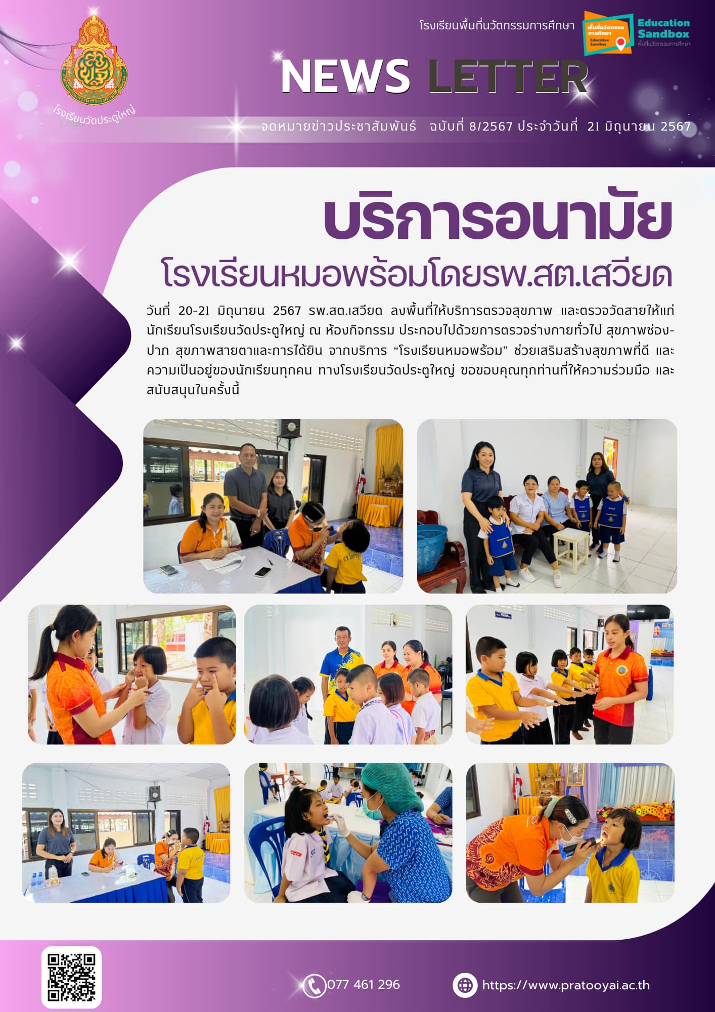 วันที่ 20-21 มิถุนายน 2567 รพ.สต.เสวียด ลงพื้นที่ให้บริการตรวจสุขภาพ และตรวจวัดสายให้แก่นักเรียนโรงเรียนวัดประตูใหญ่ ณ ห้องกิจกรรม ประกอบไปด้วยการตรวจร่างกายทั่วไป สุขภาพช่อง-ปาก สุขภาพสายตาและการได้ยิน จากบริการ “โรงเรียนหมอพร้อม” ช่วยเสริมสร้างสุขภาพที่ดี และความเป็นอยู่ของนักเรียนทุกคน ทางโรงเรียนวัดประตูใหญ่ ขอขอบคุณทุกท่านที่ให้ความร่วมมือ และสนับสนุนในครั้งนี้