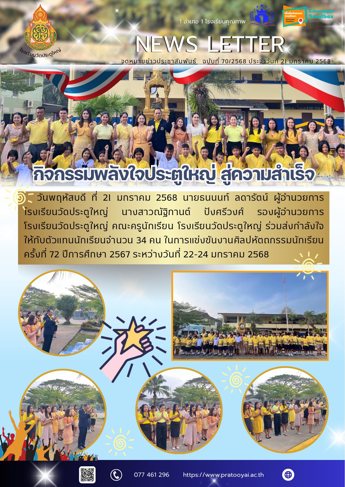 วันอังคาร ที่ 21 มกราคม 2568 นายธนนนท์ ลดารัตน์ ผู้อำนวยการโรงเรียนวัดประตูใหญ่ นางสาวณัฐิกานต์ ปังศรีวงศ์ รองผู้อำนวยการโรงเรียนวัดประตูใหญ่ คณะครูนักเรียน โรงเรียนวัดประตูใหญ่ ร่วมส่งกำลังใจให้กับตัวแทนนักเรียนจำนวน 34 คน ในการแข่งขันงานศิลปหัตถกรรมนักเรียน ครั้งที่ 72 ปีการศึกษา 2567 ระหว่างวันที่ 22-24 มกราคม 2568