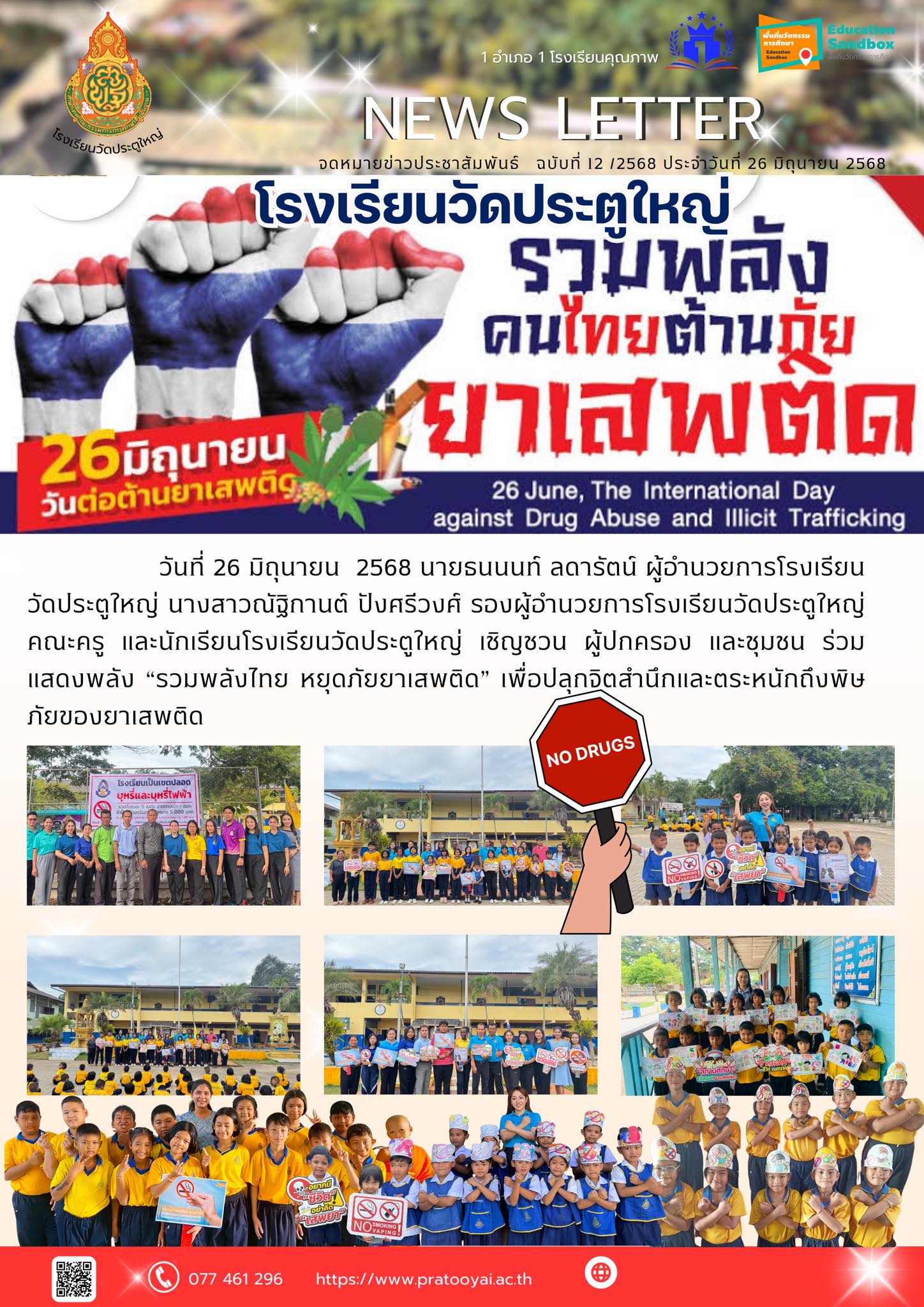 วันที่ 26 มิถุนายน 2568 นายธนนนท์ ลดารัตน์ ผู้อำนวยการโรงเรียนวัดประตูใหญ่ นางสาวณัฐิกานต์ ปังศรีวงศ์ รองผู้อำนวยการโรงเรียนวัดประตูใหญ่ คณะครู และนักเรียนโรงเรียนวัดประตูใหญ่ เชิญชวน ผู้ปกครอง และชุมชน ร่วมแสดงพลัง “รวมพลังไทย หยุดภัยยาเสพติด” เพื่อปลุกจิตสำนึกและตระหนักถึงพิษภัยของยาเสพติด