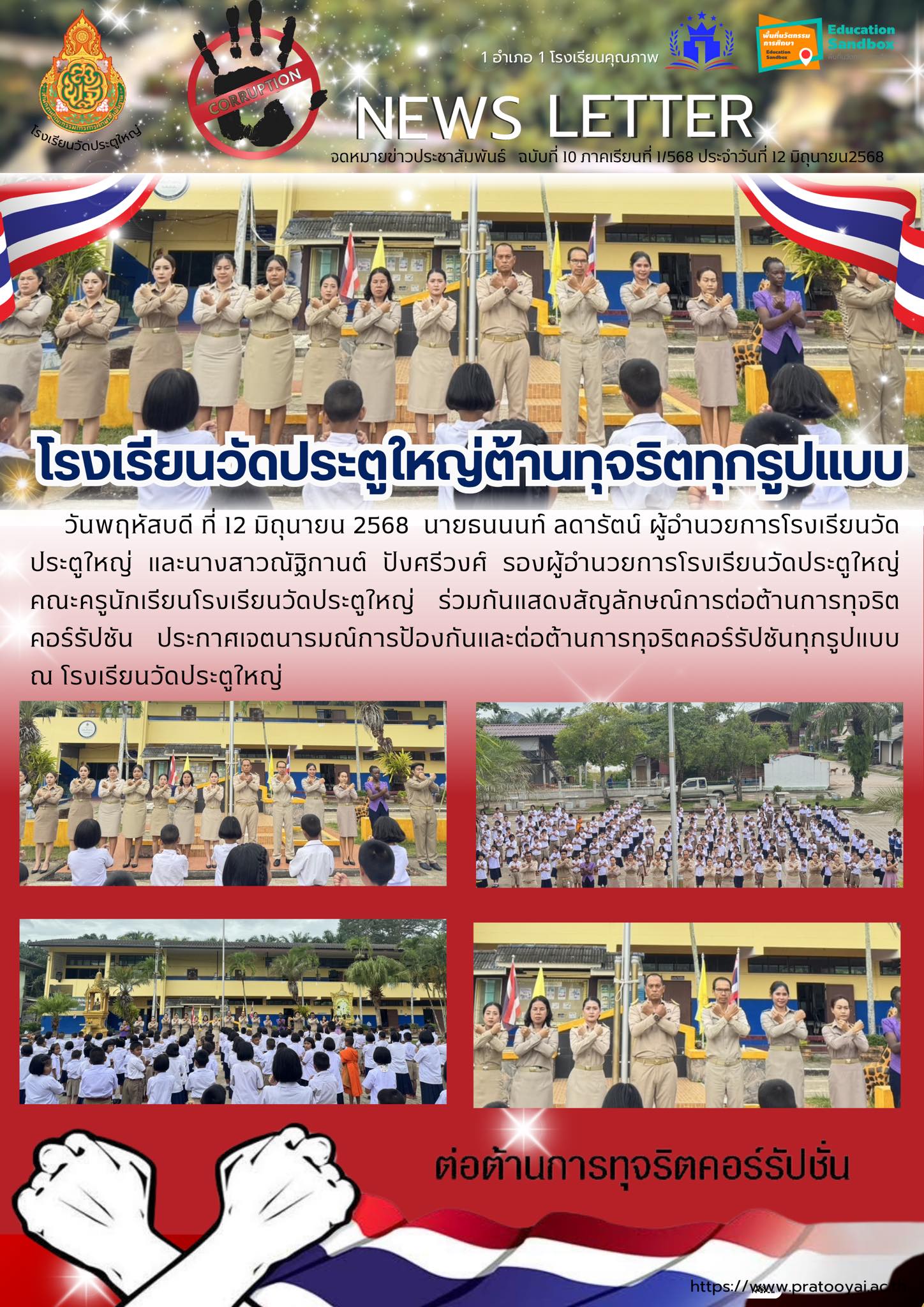 วันพฤหัสบดี ที่ 12 มิถุนายน 2568 นายธนนนท์ ลดารัตน์ ผู้อำนวยการโรงเรียนวัดประตูใหญ่ และนางสาวณัฐิกานต์ ปังศรีวงศ์ รองผู้อำนวยการโรงเรียนวัดประตูใหญ่ คณะครูนักเรียนโรงเรียนวัดประตูใหญ่ ร่วมกันแสดงสัญลักษณ์การต่อต้านการทุจริตคอร์รัปชัน ประกาศเจตนารมณ์การป้องกันและต่อต้านการทุจริตคอร์รัปชันทุกรูปแบบ ณ โรงเรียนวัดประตูใหญ่