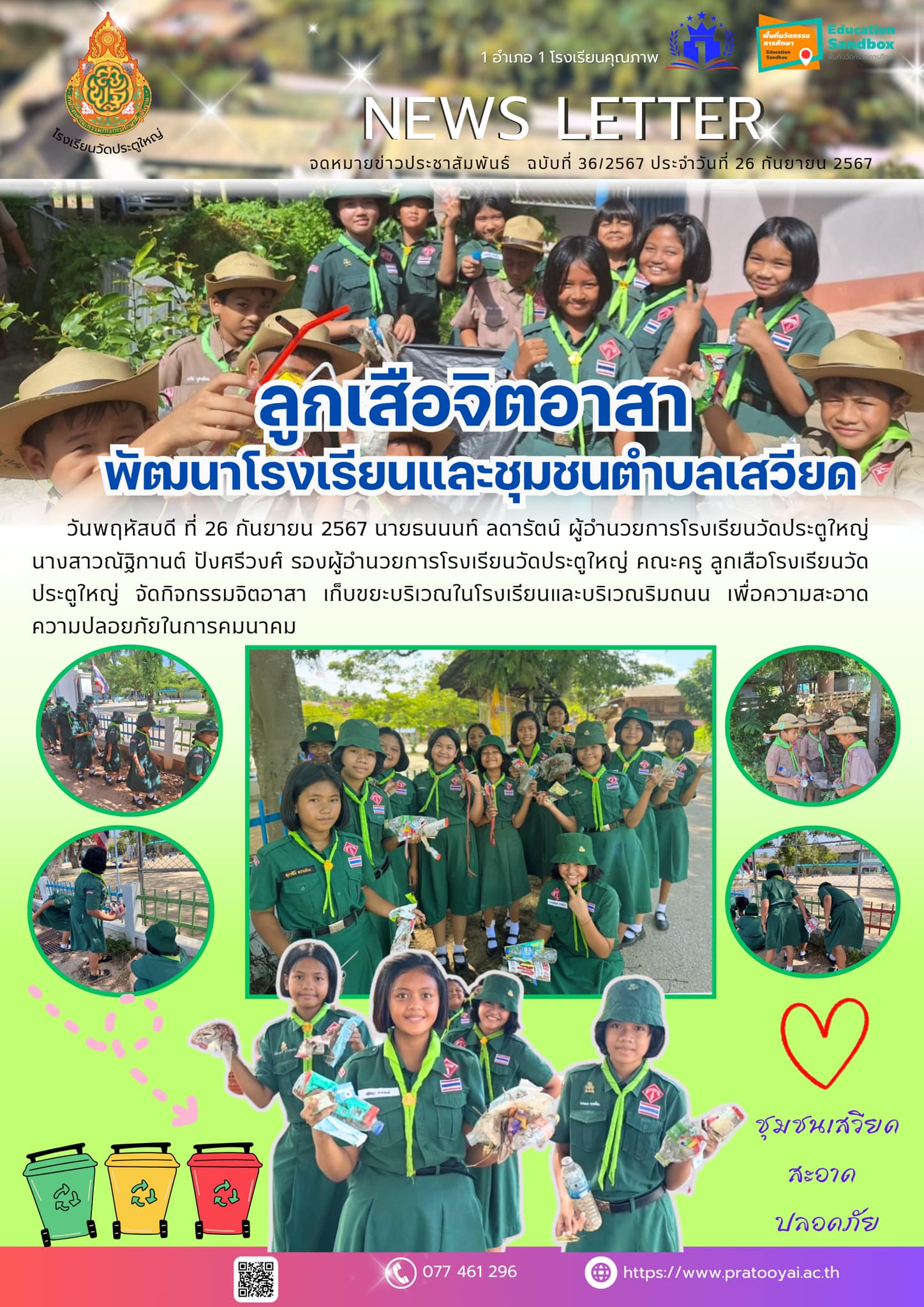 วันพฤหัสบดี ที่ 26 กันยายน 2567 นายธนนนท์ ลดารัตน์ ผู้อำนวยการโรงเรียนวัดประตูใหญ่ นางสาวณัฐิกานต์ ปังศรีวงศ์ รองผู้อำนวยการโรงเรียนวัดประตูใหญ่ คณะครู ลูกเสือโรงเรียนวัดประตูใหญ่ จัดกิจกรรมจิตอาสา เก็บขยะบริเวณในโรงเรียนและบริเวณริมถนน เพื่อความสะอาด ความปลอยภัยในการคมนาคม