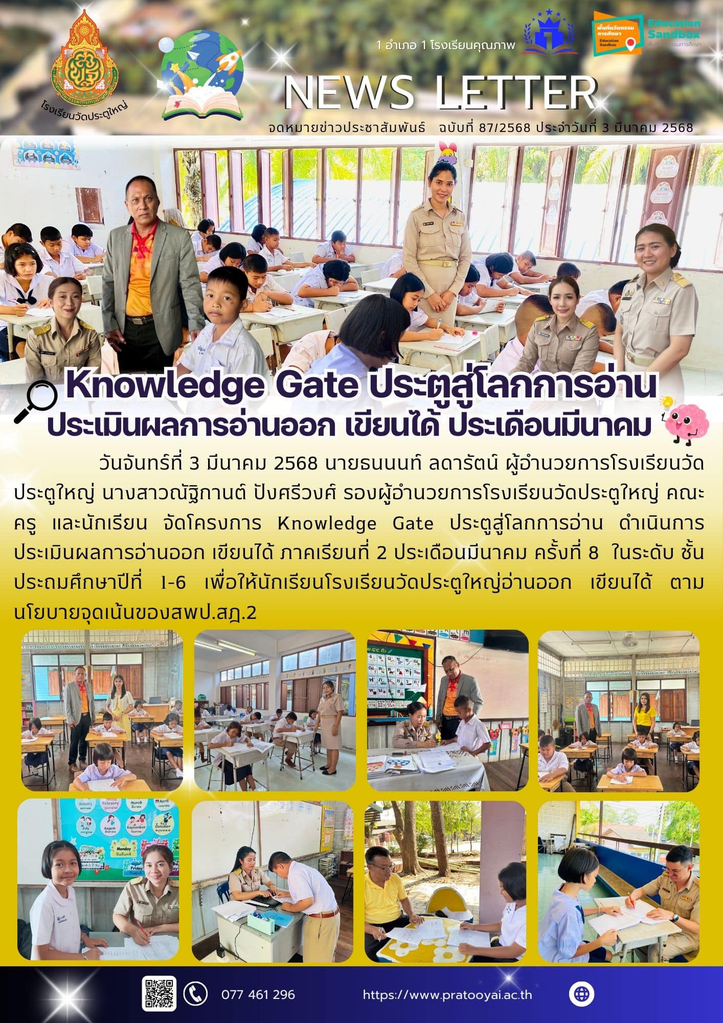 วันจันทร์ที่ 3 มีนาคม 2568 นายธนนนท์ ลดารัตน์ ผู้อำนวยการโรงเรียนวัดประตูใหญ่ นางสาวณัฐิกานต์ ปังศรีวงศ์ รองผู้อำนวยการโรงเรียนวัดประตูใหญ่ คณะครู และนักเรียน จัดโครงการ Knowledge Gate ประตูสู่โลกการอ่าน ดำเนินการประเมินผลการอ่านออก เขียนได้ ภาคเรียนที่ 2 ประเดือนมีนาคม ครั้งที่ 8 ในระดับ ชั้นประถมศึกษาปีที่ 1-6 เพื่อให้นักเรียนโรงเรียนวัดประตูใหญ่อ่านออก เขียนได้ ตามนโยบายจุดเน้นของสพป.สฎ.2