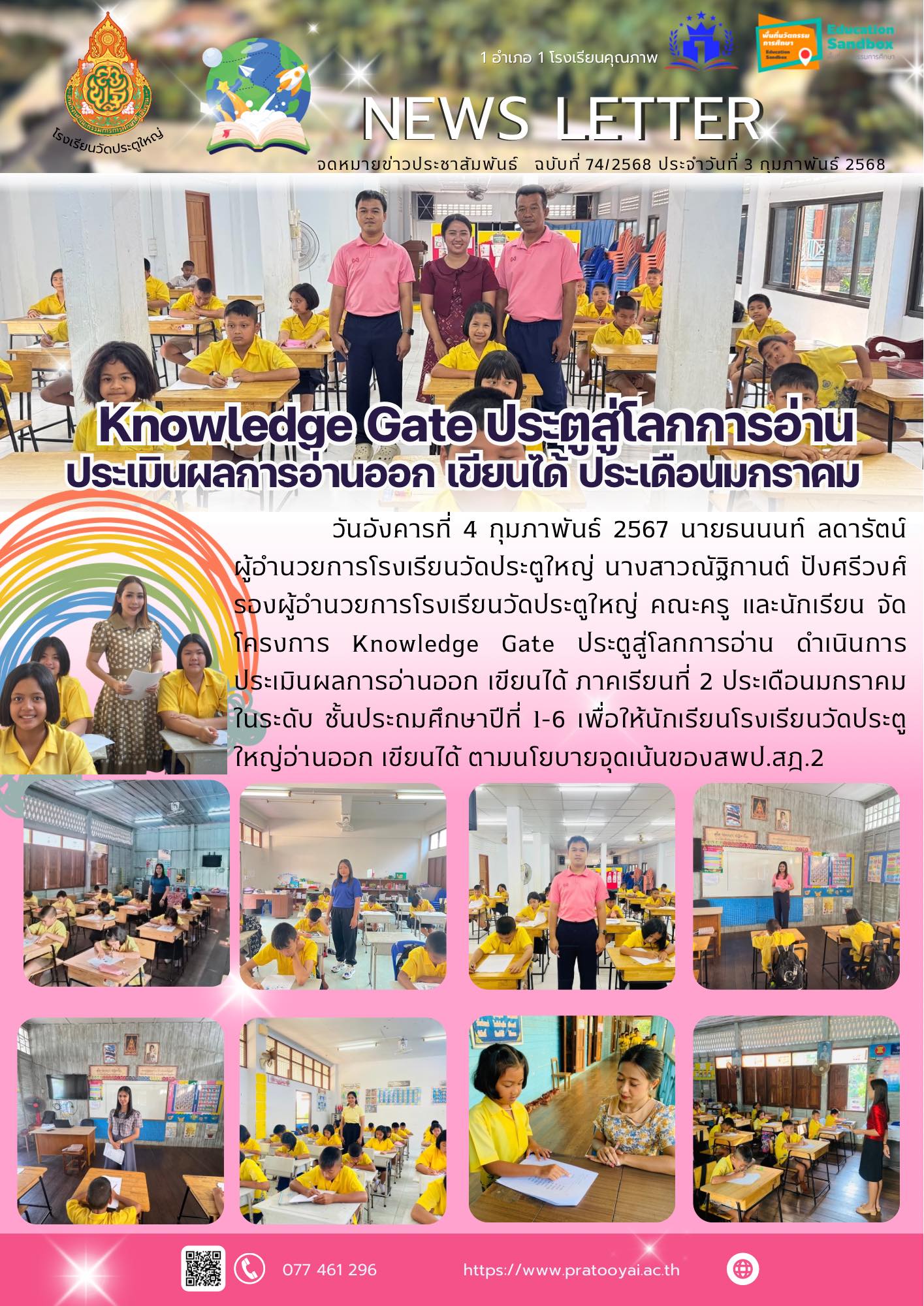 วันอังคารที่ 4 กุมภาพันธ์ 2567 นายธนนนท์ ลดารัตน์ ผู้อำนวยการโรงเรียนวัดประตูใหญ่ นางสาวณัฐิกานต์ ปังศรีวงศ์ รองผู้อำนวยการโรงเรียนวัดประตูใหญ่ คณะครู และนักเรียน จัดโครงการ Knowledge Gate ประตูสู่โลกการอ่าน ดำเนินการประเมินผลการอ่านออก เขียนได้ ภาคเรียนที่ 2 ประเดือนมกราคม ในระดับ ชั้นประถมศึกษาปีที่ 1-6 เพื่อให้นักเรียนโรงเรียนวัดประตูใหญ่อ่านออก เขียนได้ ตามนโยบายจุดเน้นของ สพป.สฎ.2