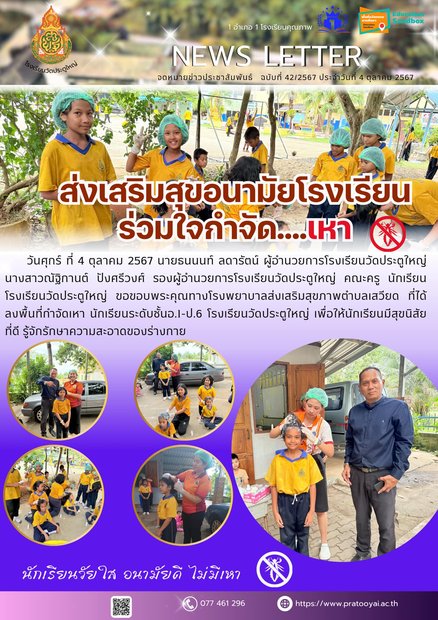 วันศุกร์ ที่ 4 ตุลาคม 2567 นายธนนนท์ ลดารัตน์ ผู้อำนวยการโรงเรียนวัดประตูใหญ่ นางสาวณัฐิกานต์ ปังศรีวงศ์ รองผู้อำนวยการโรงเรียนวัดประตูใหญ่ คณะครู นักเรียนโรงเรียนวัดประตูใหญ่ ขอขอบพระคุณทางโรงพยาบาลส่งเสริมสุขภาพตำบลเสวียด ที่ได้ลงพื้นที่กำจัดเหา นักเรียนระดับชั้นอ.1-ป.6 โรงเรียนวัดประตูใหญ่ เพื่อให้นักเรียนมีสุขนิสัยที่ดี รู้จักรักษาความสะอาดของร่างกาย